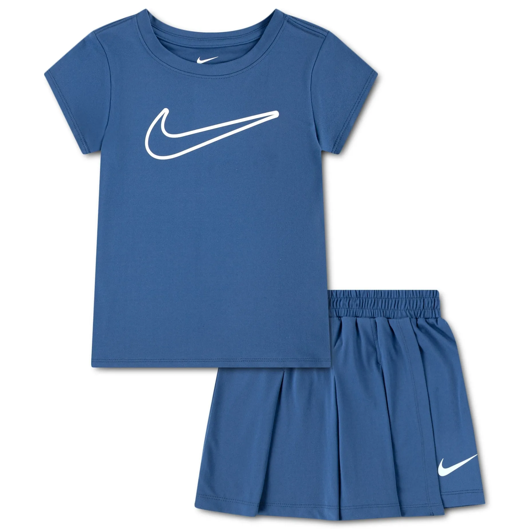 This 2-piece set from Nike is an effortless way to dress your little girl for fun. Both pieces are made of poly jersey knit fabric with added stretch for ease of movement, and enhanced with moisture-wicking Dri-FIT Technology to help keep kids cool and dry during activity. The tee has a tagless crewneck for fuss-free wear and the matching skort features a pleated overlay on the front and a stretchy waistband for a comfy fit that lasts all play, all day.