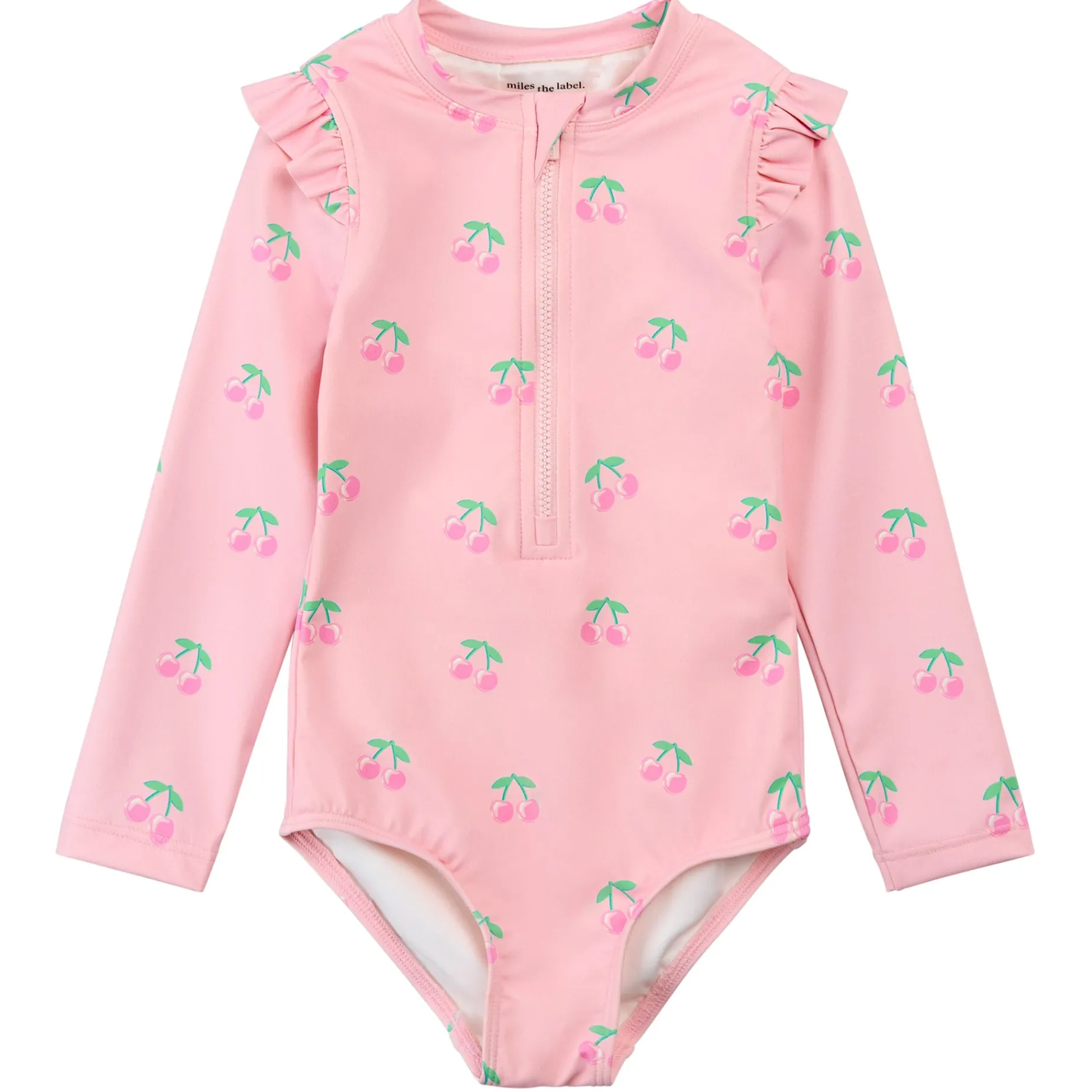 Sweet and summery, this pretty-in-pink rash guard suit features an all-over cherry print and a flutter trim along each shoulder. The half-zip front makes getting ready before and after a splash quick and easy, while the quick-drying fabric with UPF 50+ keeps her comfortable and safe during water or sand play.