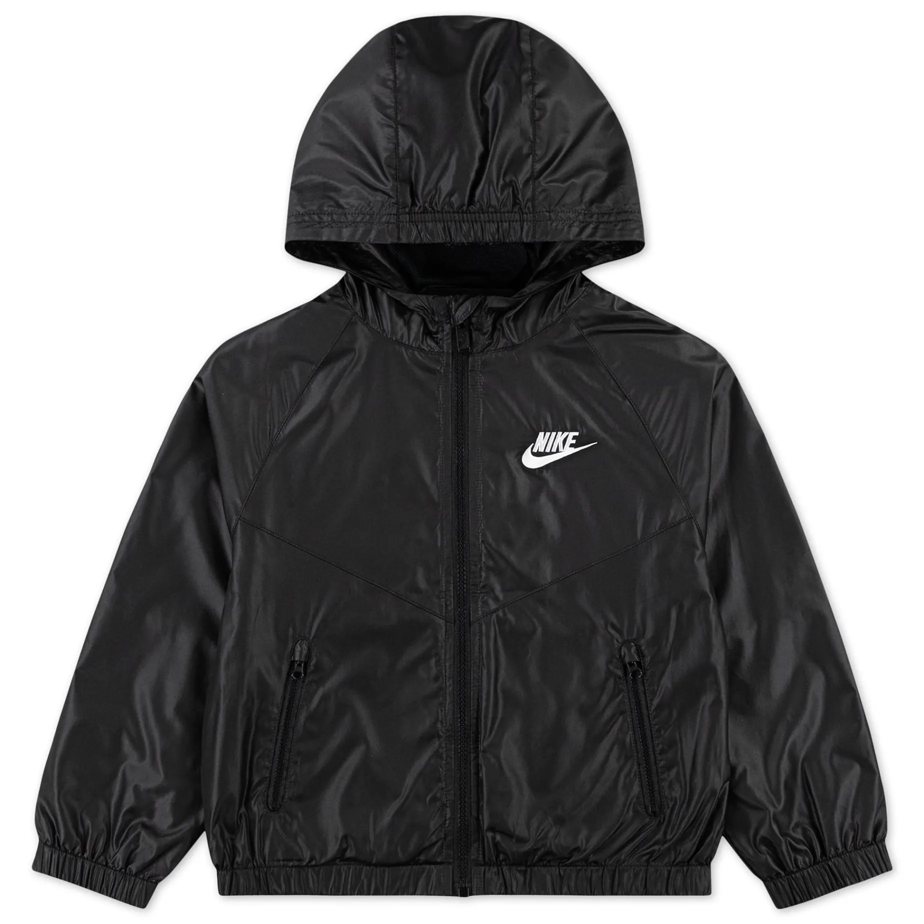 No such thing as a rain delay with this Nike windbreaker jacket, which features signature chevron seam work, a full-zip closure for easy layering, and provides lightweight warmth. Pockets on the sides come in handy for stashing small essentials, the cozy hood and water-resistant finish help kiddos stay dry in light rains, and the elasticized cuffs and hem help secure the fit against wind gusts.