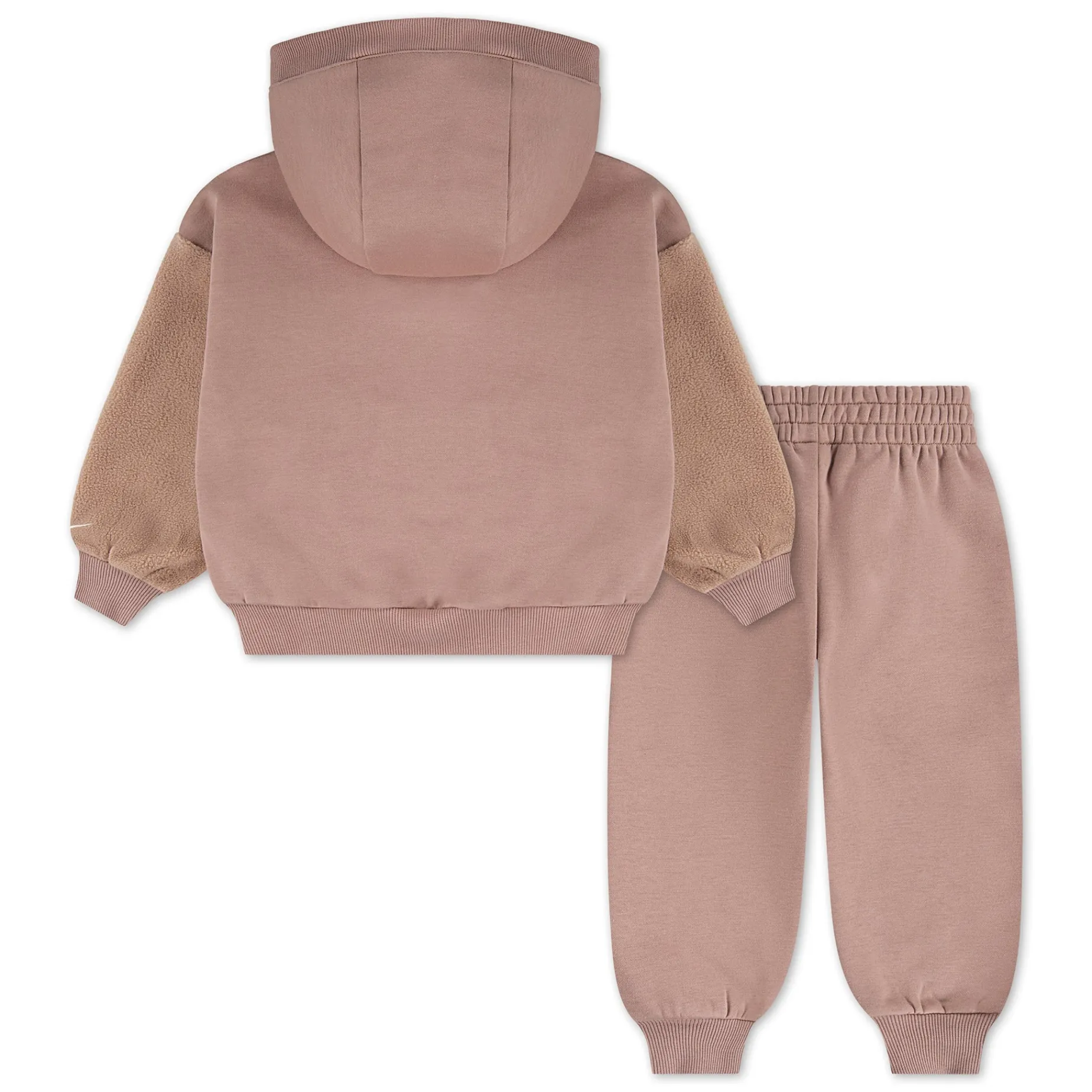 Get your little critter kitted out in cozy comfort with this adorable two-piece Nike set, which is made of plush fleece fabric to leave them feeling snuggly and warm. The hoodie features dropped shoulders that relax the fit and the kangaroo pocket features little ears and an embroidered face for a super cute touch. The pants have a comfy stretchy waistband and tapered legs for a secure feel that spotlights your child’s Nikes.
