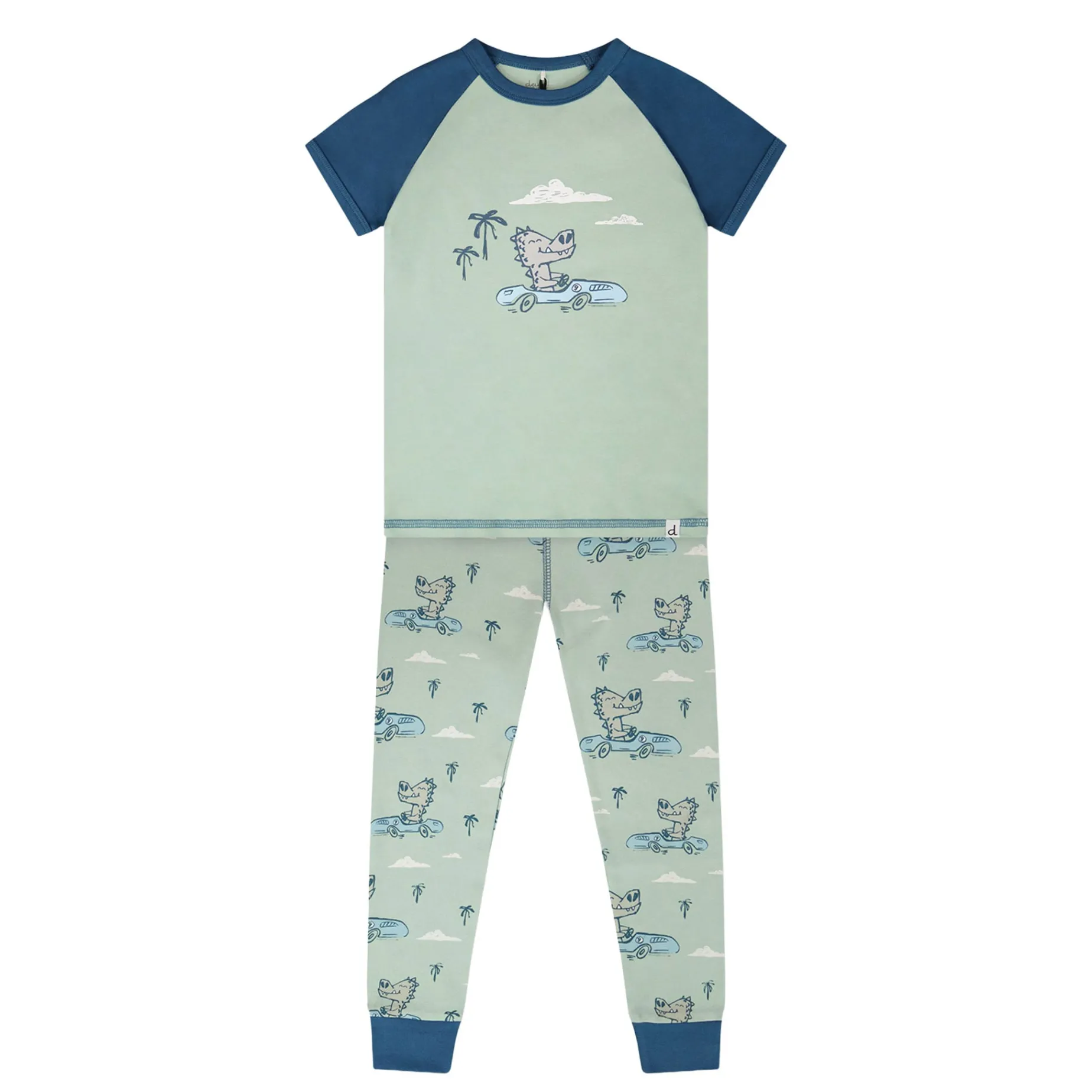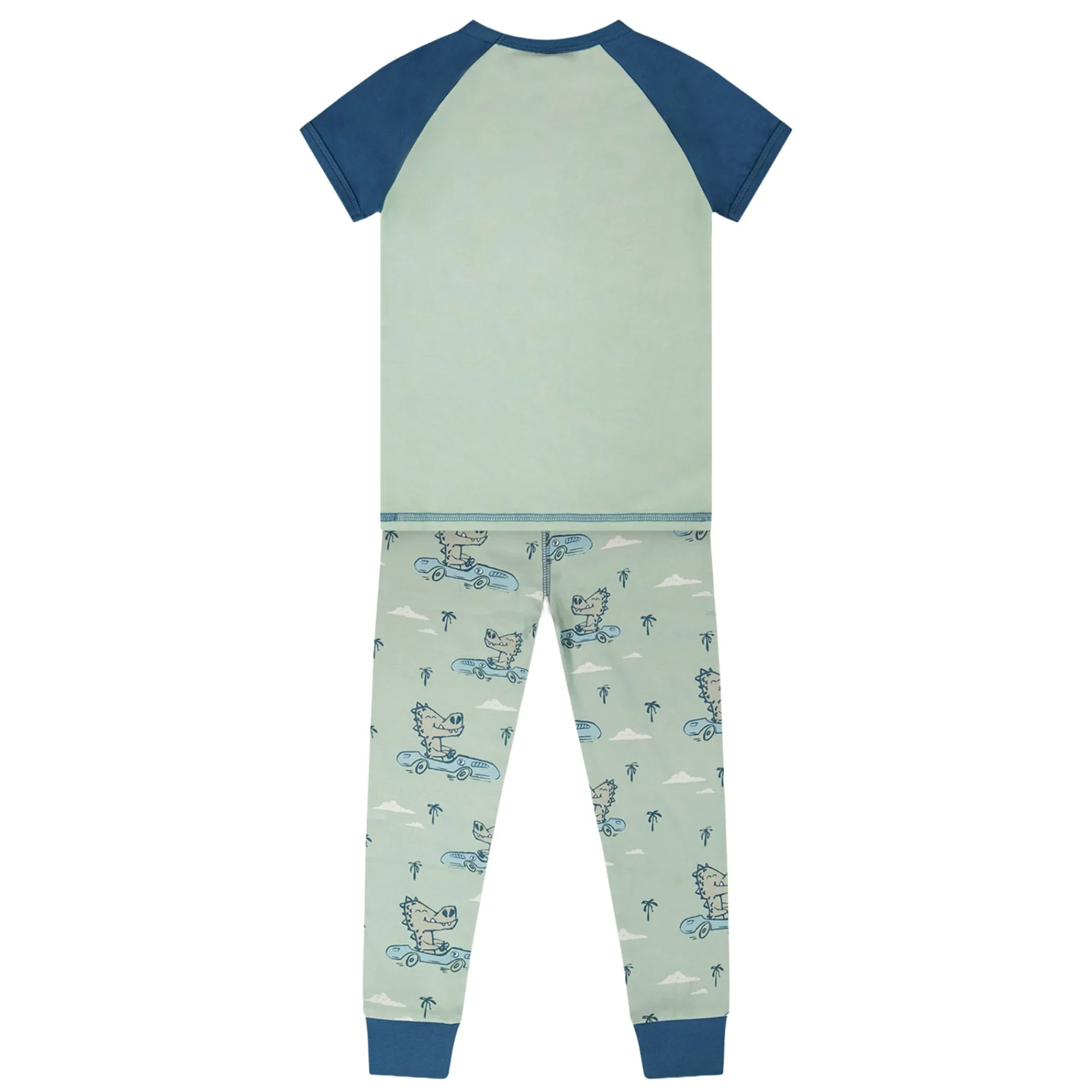 Bedtime roars with fun in this organic cotton two-piece pyjama set in blue with dino print. This set features a t-shirt with short contrasting raglan sleeves and a playful dinosaur graphic, while the matching pants show an allover dinosaur pattern with fitted contrasting cuffs for comfort. Crafted in soft 100% organic cotton, this cozy set from the “Starry Night” collection is perfect for little adventurers.