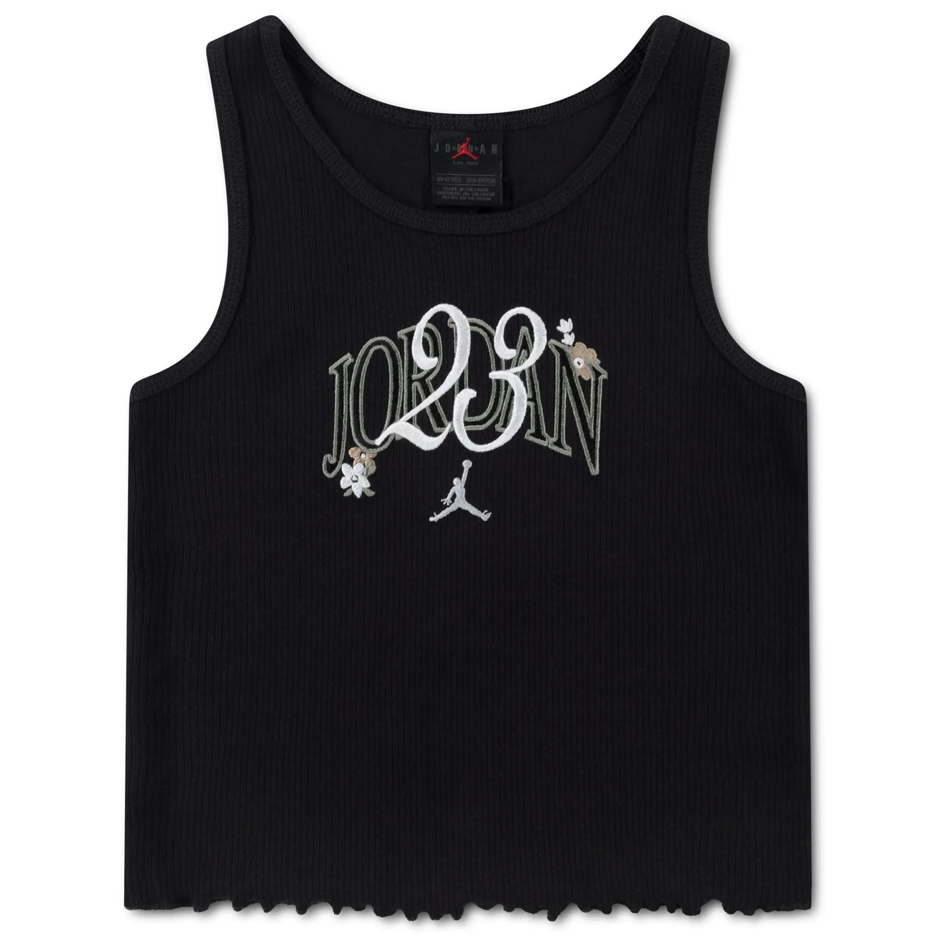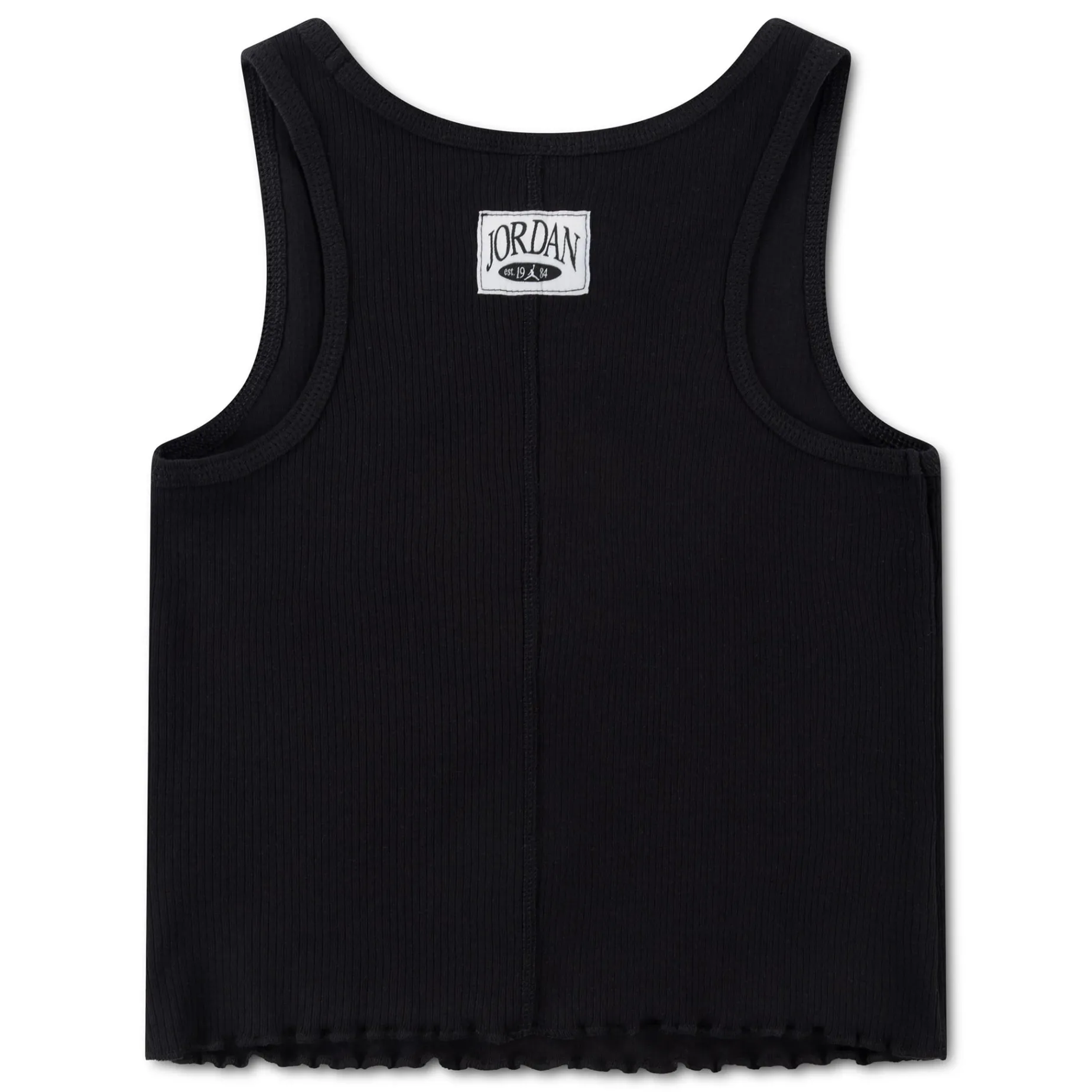 Made of soft, rib knit fabric, this Jordan tank top has 90’s babydoll tee vibes. It has a scoop neck, tagless racerback, features logo embroidery, and the lettuce hem adds a delicate touch.