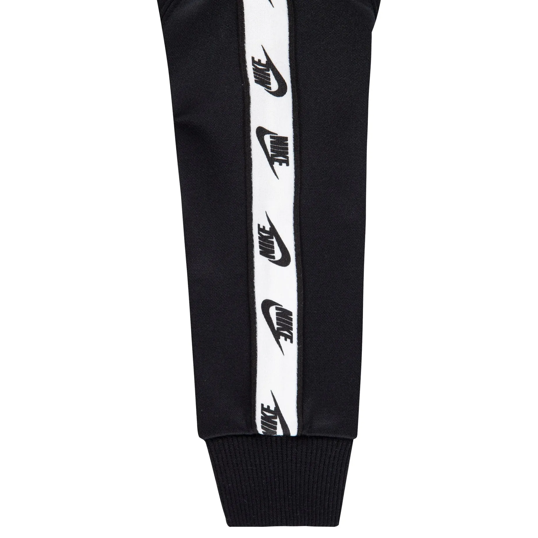 Pants: Encased elastic waistband. Tapered legs with ribbed cuffs. Logo taping trim on outer sides of legs.
