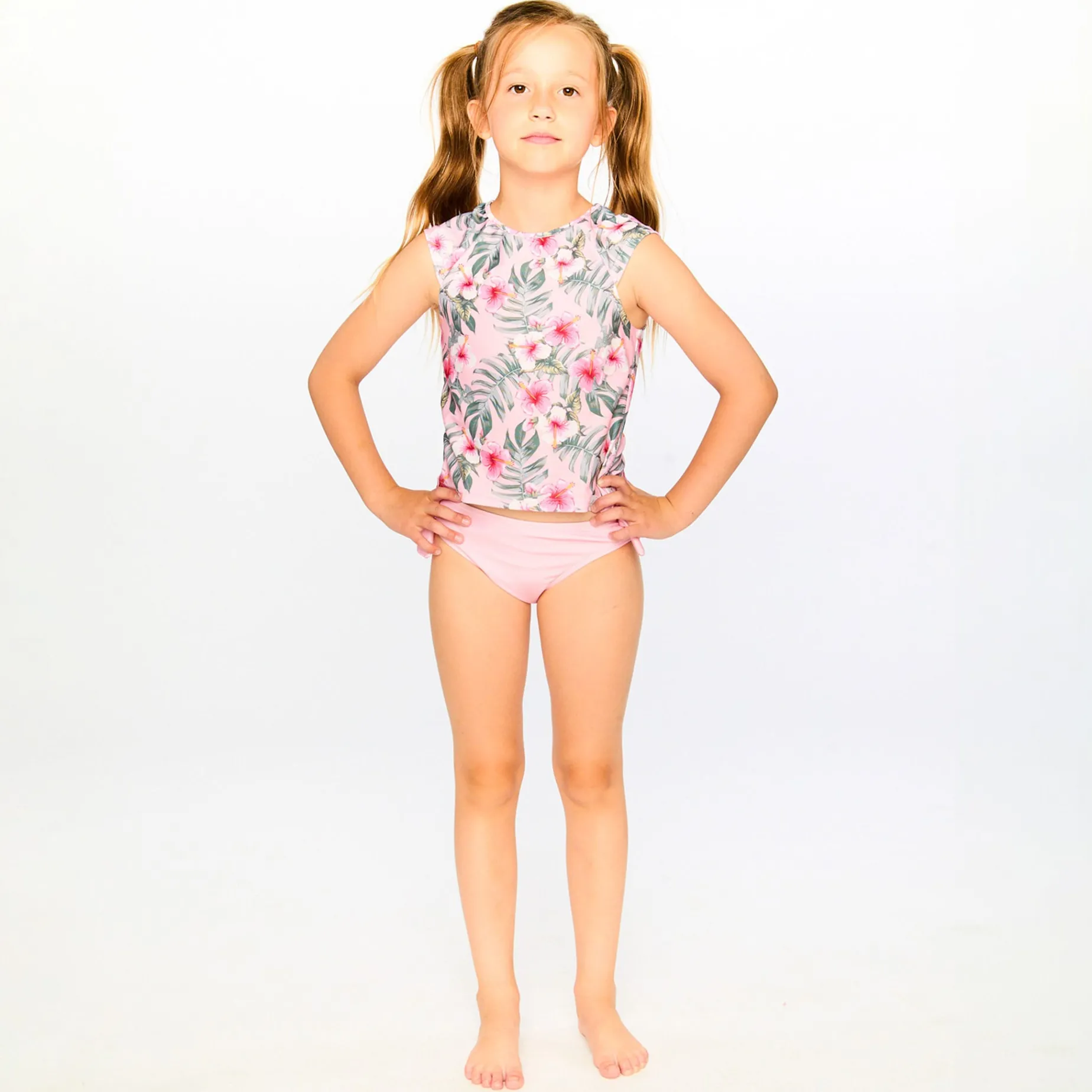 Fresh and playful, this two-piece swimsuit in pink with hibiscus print is made for sunny days. This bathing set features a sporty top with cap sleeves, a round neckline, and an allover tropical hibiscus and leaf print. The matching bikini bottom comes in solid pink with charming side ties for an adjustable fit.