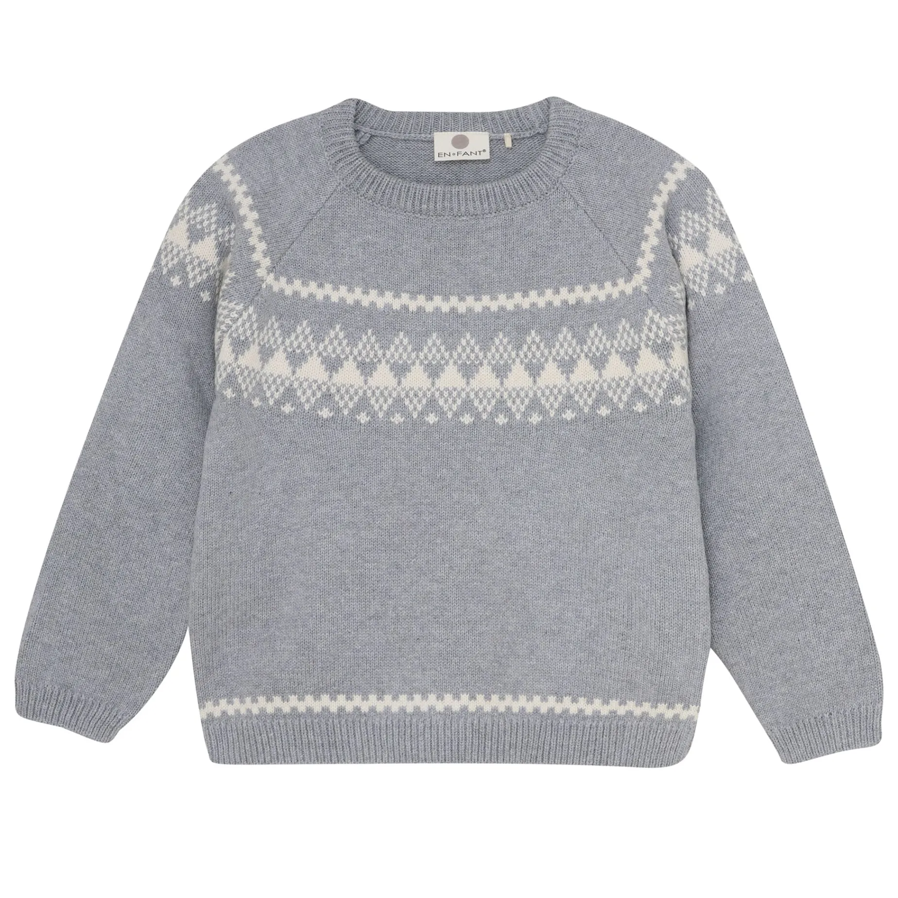 Beautiful knitted sweater in a soft and warm wool blend with a detailed jacquard pattern extending across the chest and continuing onto the sleeves. The design features a round neckline and ribbed edges at the sleeves, neckline, and hem, ensuring a comfortable fit and stylish look. Ideal for everyday wear and special occasions during cooler months.