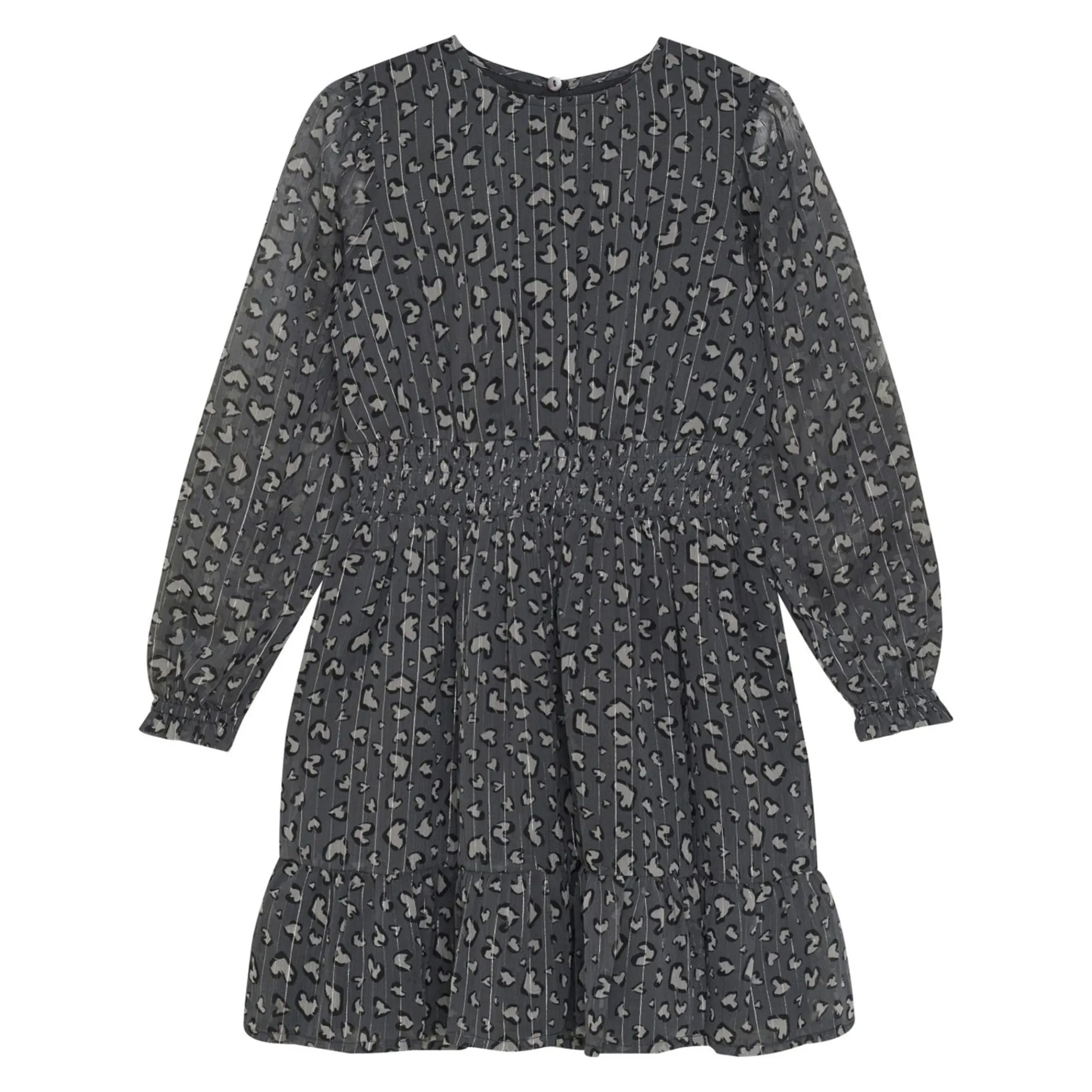 Sweet long-sleeved all-over printed dress from Creamie. The dress has a wide smock elastic in the waist and a smaller smock elastic in the sleeve opening. The sleeves are semi-transparent and the rest of the dress consists of two layers, where the inner one is in a tightly woven cotton quality, so that it does not appear transparent. It closes at the back with a button above a drop-shaped cutout.