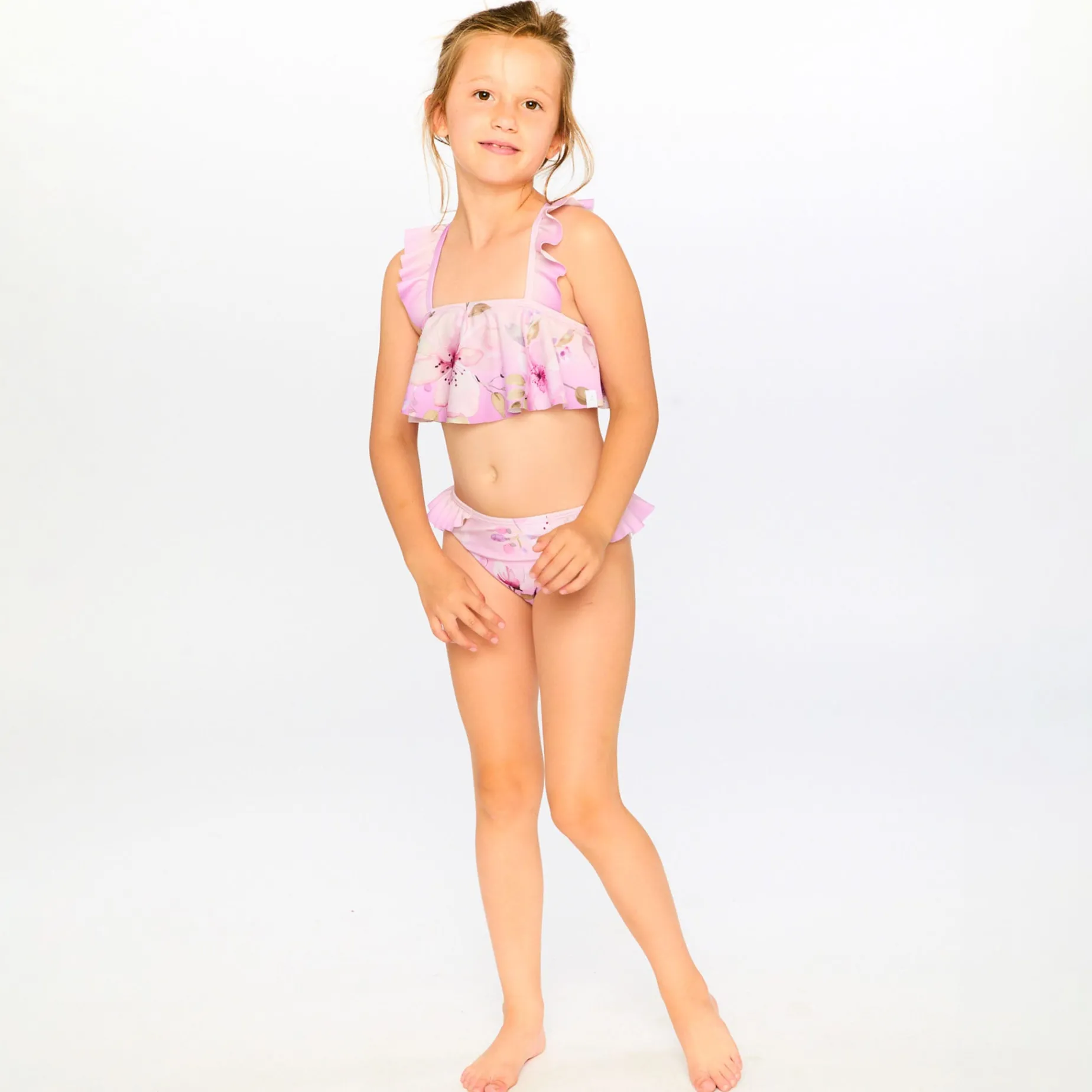 The two-piece swimsuit in purple with flower print is a sweet and playful set with ruffled crossed straps and a flared top. Made from recycled polyester with a touch of stretch, this swimsuit offers comfort, flexibility, and durability for summer adventures. A stylish and eco-friendly design from our “Like A Fish To Water” collection.