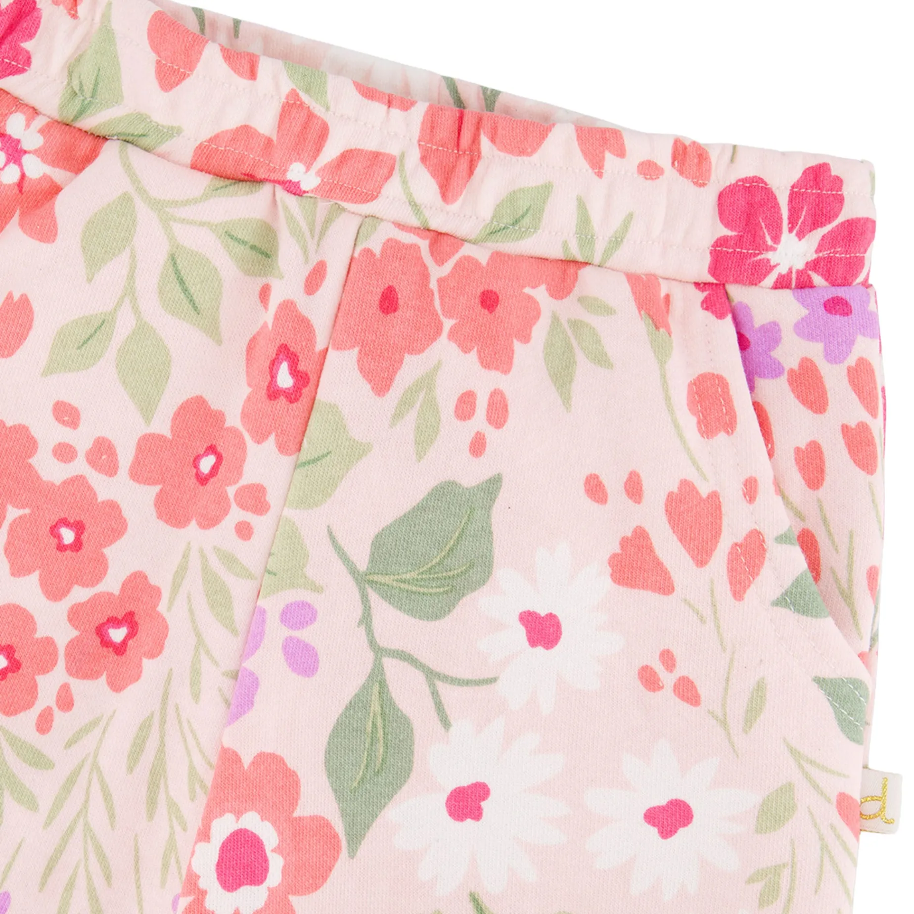 Our French terry pants pink with printed flowers are both comfy and playful. This straight-leg design features an elastic waistband, practical slant pockets, and a soft stretch feel for all-day ease. Covered in a lively pink floral print, these pants are a cheerful option for girls and baby girls alike.