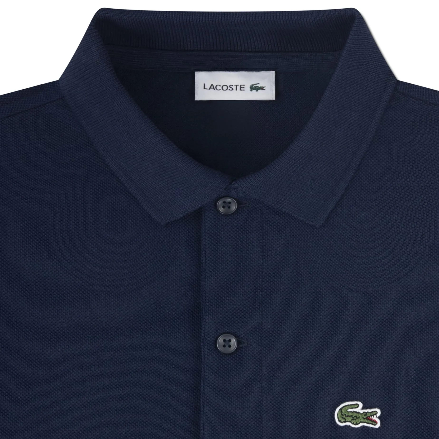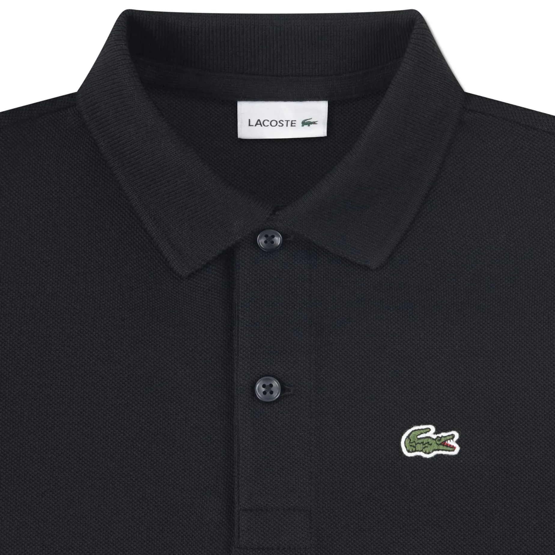 Features: Cotton petite pique knit fabric. Ribbed spread collar. Quarter-button closure. Short sleeves with ribbed cuffs. Embroidered crocodile logo patch.
