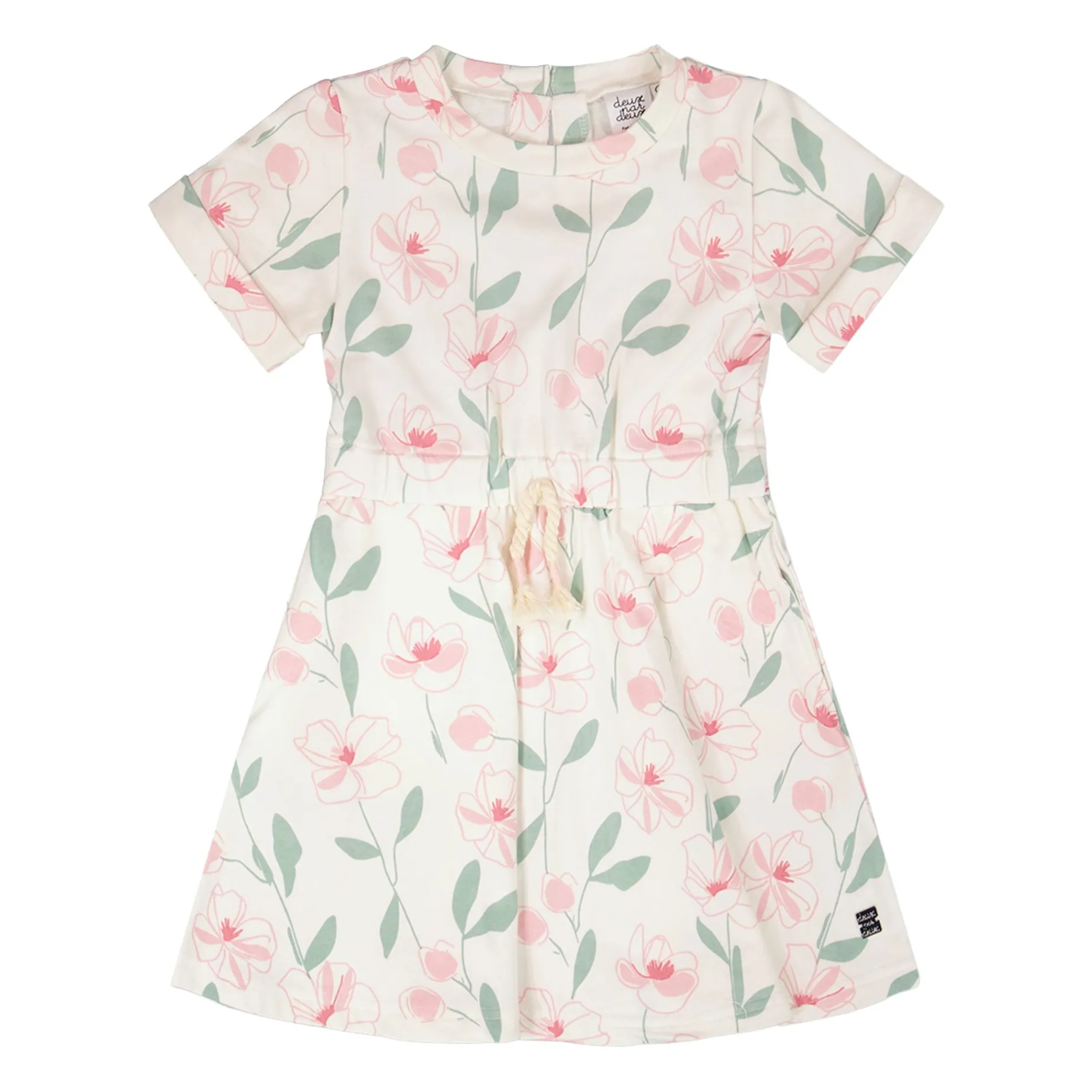 The French terry dress off white with printed flowers is a playful piece with a soft, easy fit. This casual dress features short sleeves, a flowy skirt, an adjustable waist with a drawstring, and a delicate allover floral print. Crafted from a comfortable blend of cotton and elastane, this dress is perfect for everyday wear with a touch of charm.