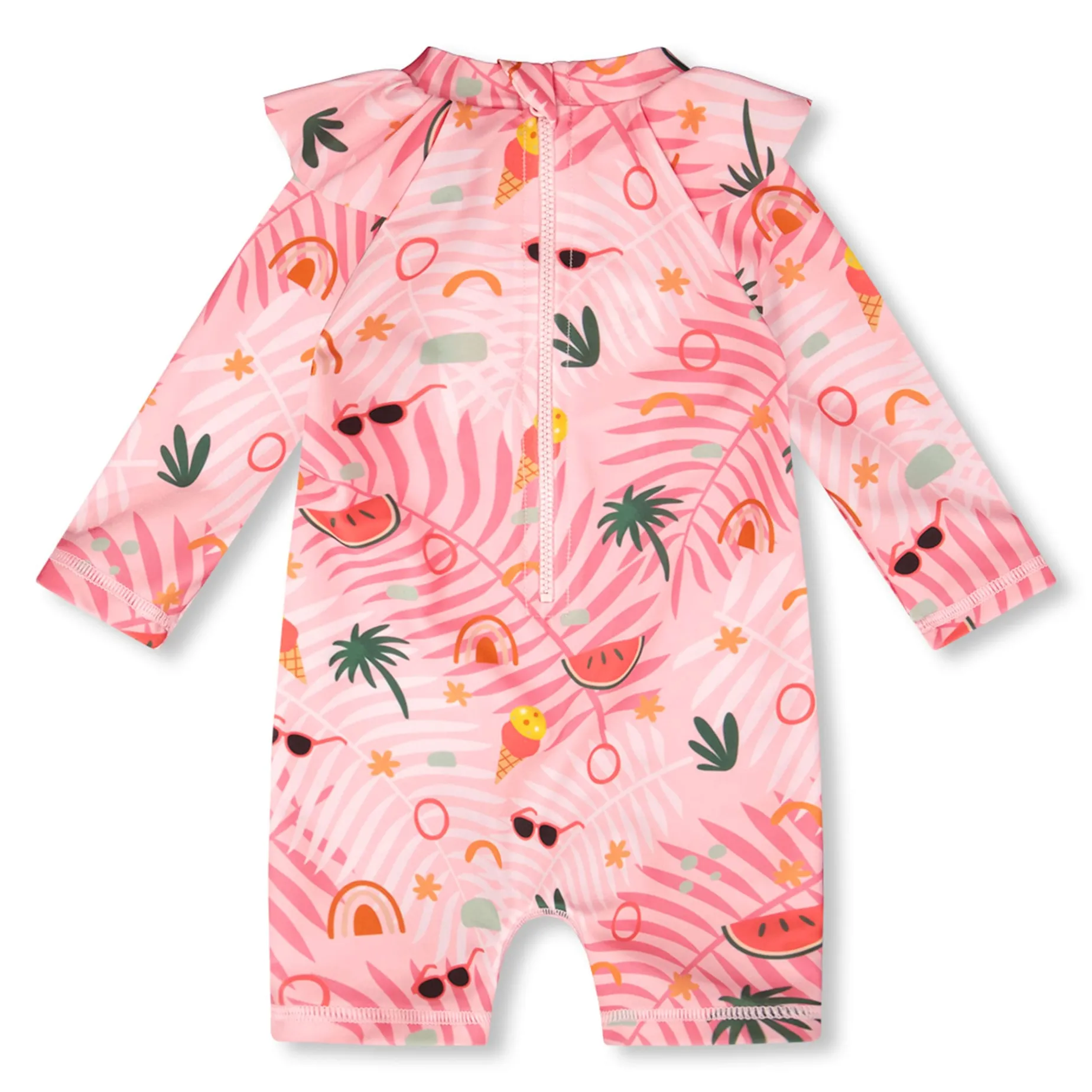 The baby and toddler one-piece long sleeve rashguard in pink with beach print is designed for sun-filled days at the beach or pool. This long-sleeve swimsuit features a vibrant beach print, playful ruffle details at the shoulders, a back zipper for easy dressing, and bottom snap closures for practicality. Crafted from recycled polyester with added stretch, it offers comfort and protection while splashing under the sun.