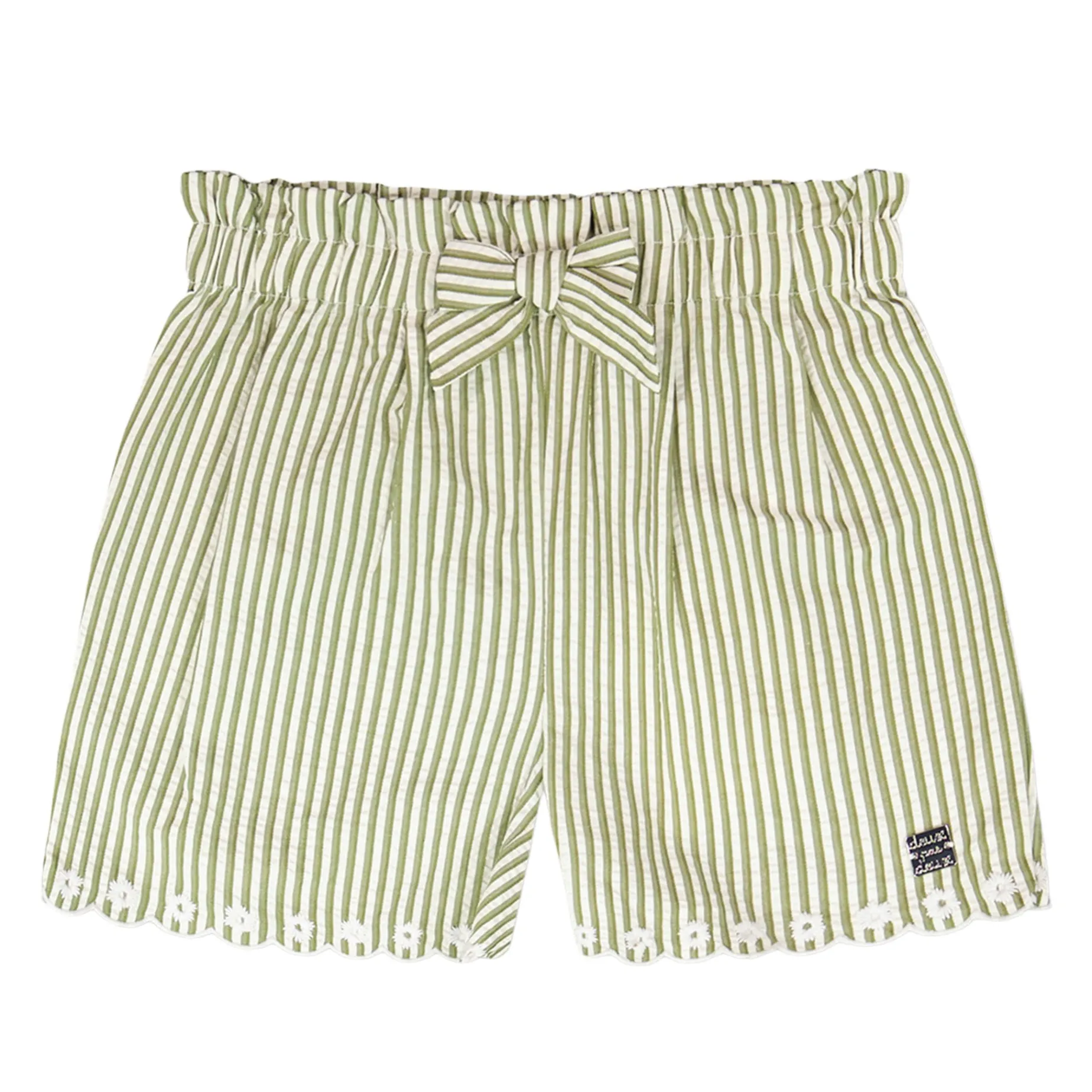 The shorts in green and off white stripes with embroidery bring a chic twist to casual wear. These bottoms are designed with delicate embroidered bottom hems, an adjustable tie at the waist, and a breezy striped fabric that gives both comfort and style. Made from a soft polyester and cotton blend, they are ideal for pairing with any top from the “Under My Straw Hat” collection.