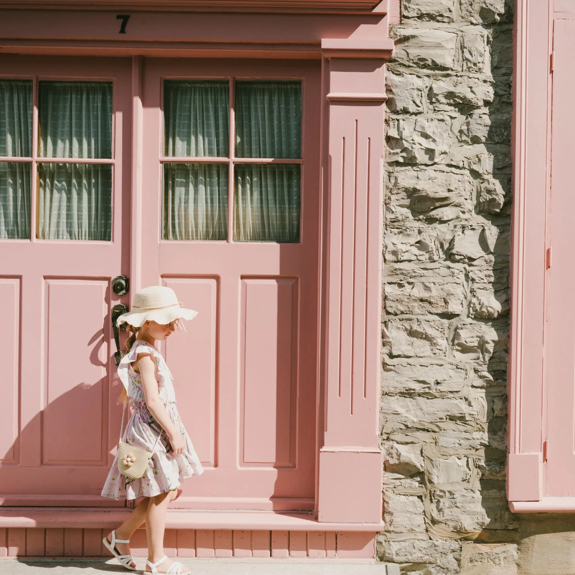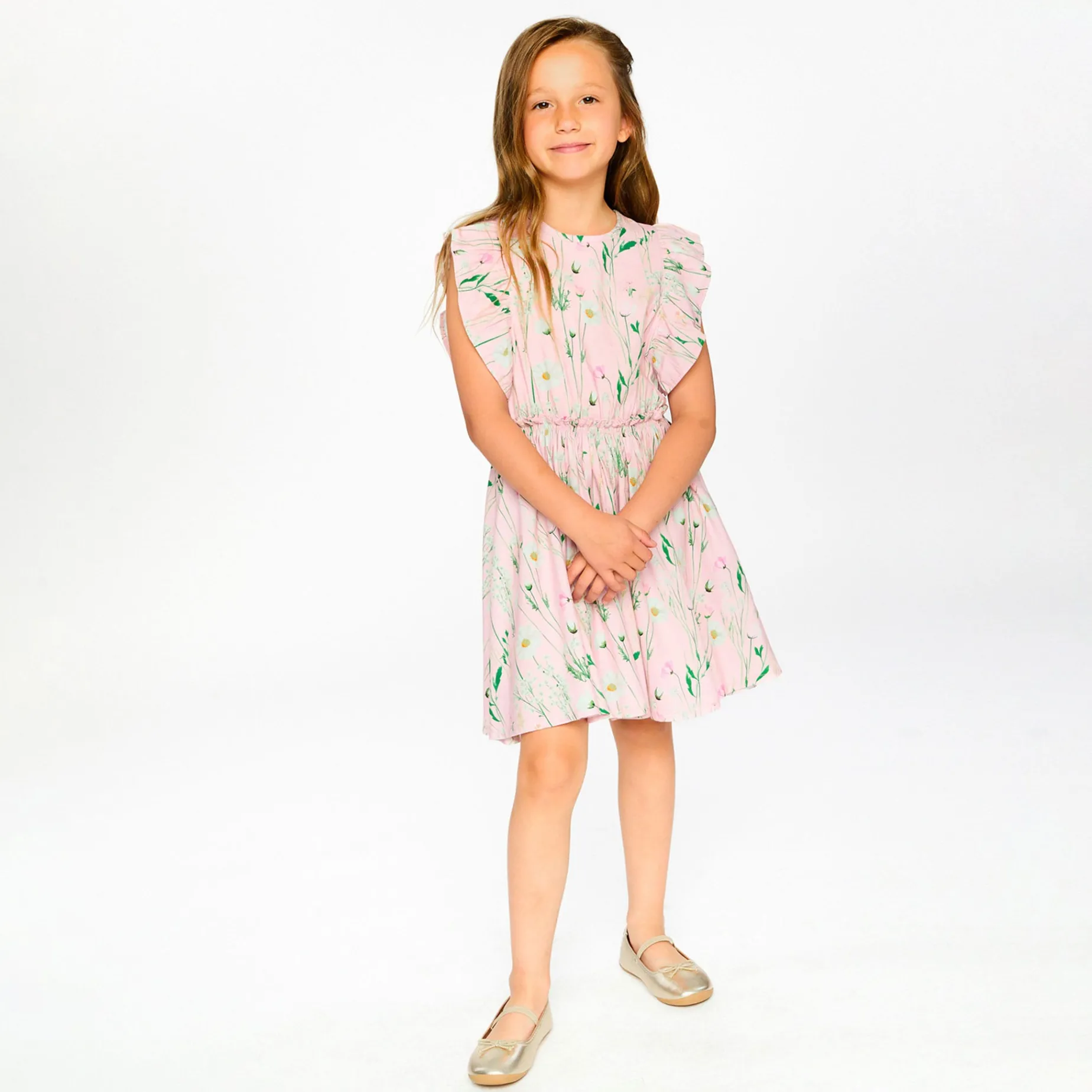 The viscose dress pink with printed flowers is light, playful, and full of charm. This sleeveless dress features delicate ruffles along the shoulders, an elastic waist with ruffles for comfort, and a flared skirt that twirls beautifully. Made from soft viscose with a cotton lining, it feels gentle against the skin and perfect for sunny days.