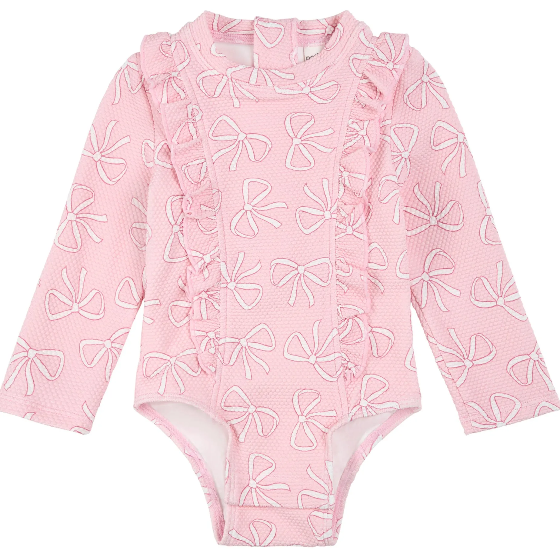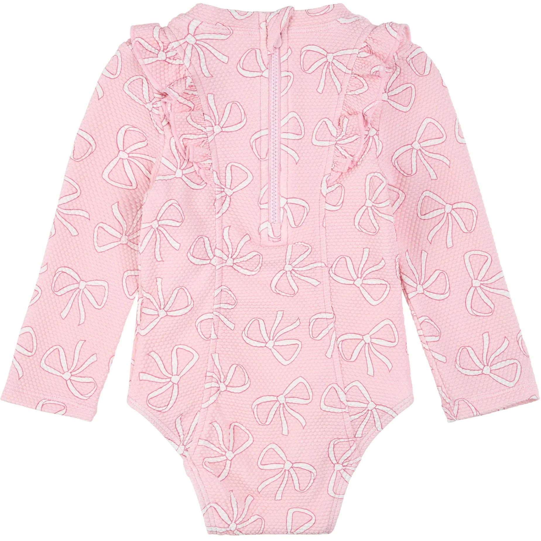 Ready for sun-soaked adventures, this long-sleeved Bows print bodysuit keeps her comfortable, covered and cute. The waffle-textured one piece is soft and stretchy for easy wear while the ruffle trim down both sides add a playfulness she’ll love. Perfect for days without a cloud in the sky, the swimsuit has built-in UPF50+ sun protection.