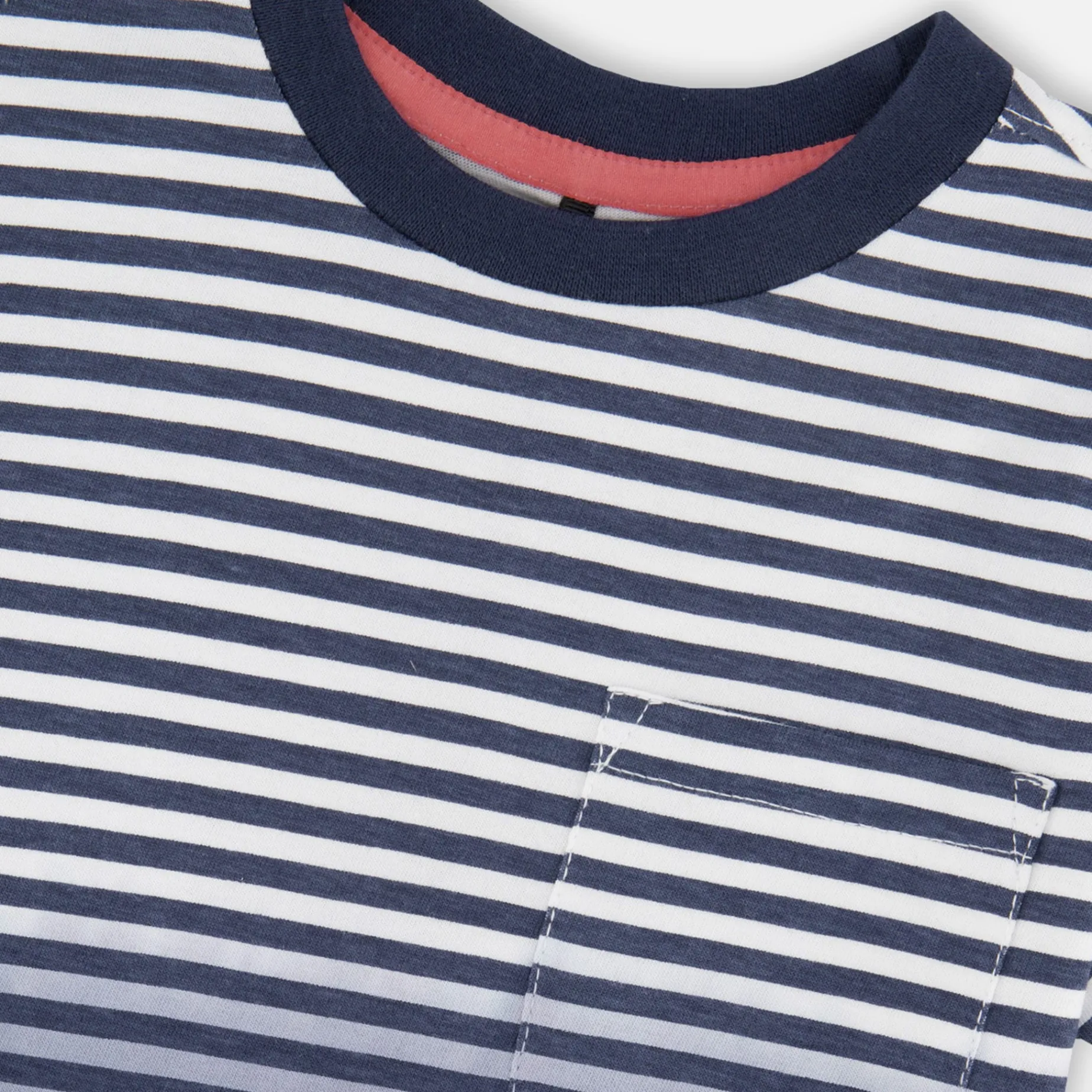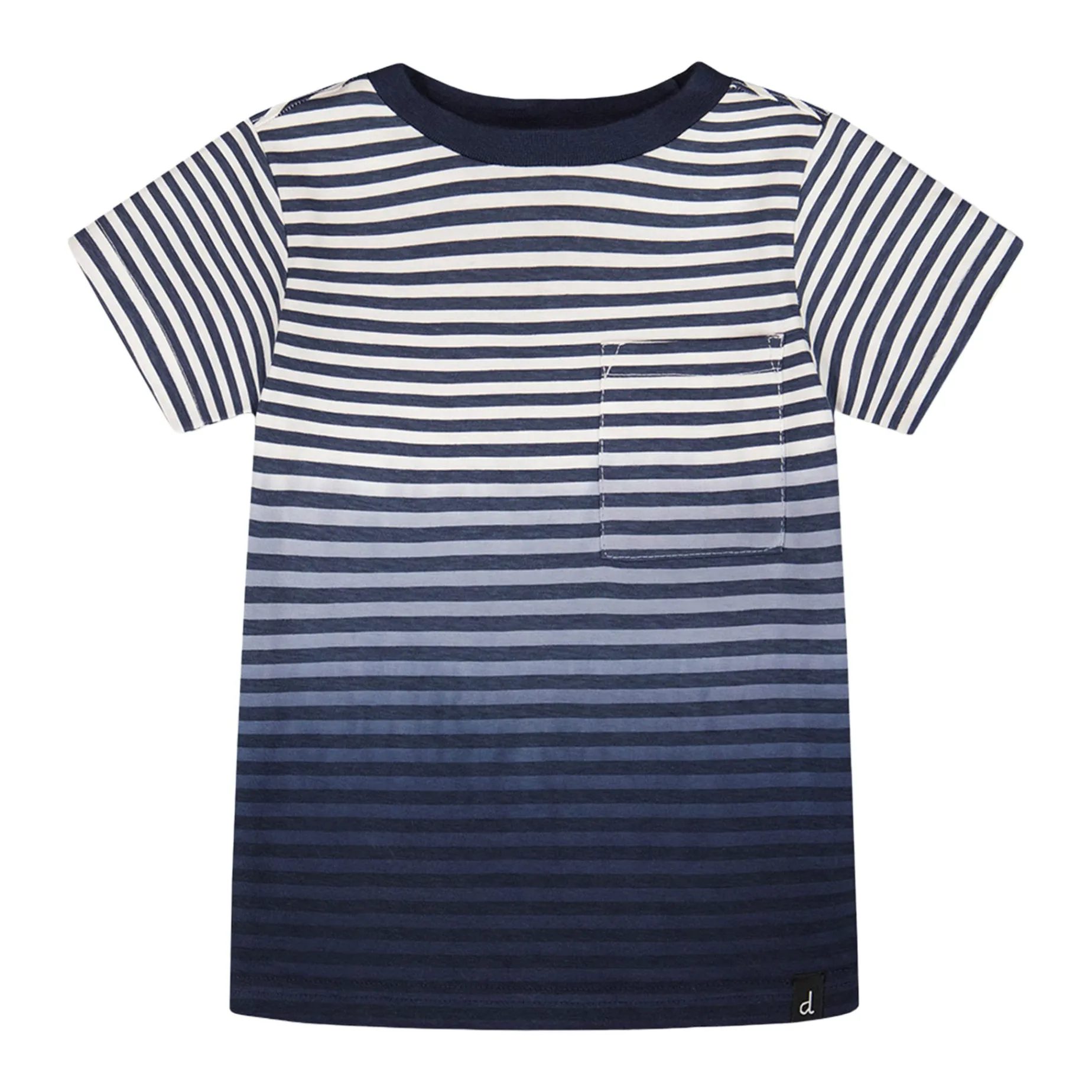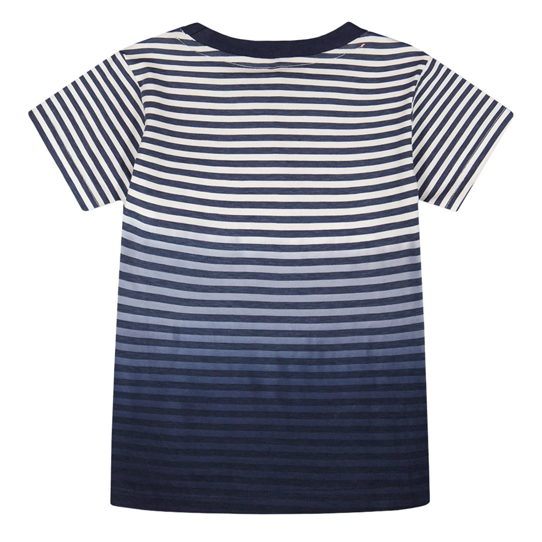 The organic cotton short sleeve t-shirt in blue gradient stripes is a playful essential for sunny days. This tee features a round neckline, a small patch pocket on the chest, short sleeves, and a lively striped gradient in shades of blue that makes it stand out. Made from breathable organic cotton, it’s a perfect match for any bottom in the “Coastal Days” collection.
