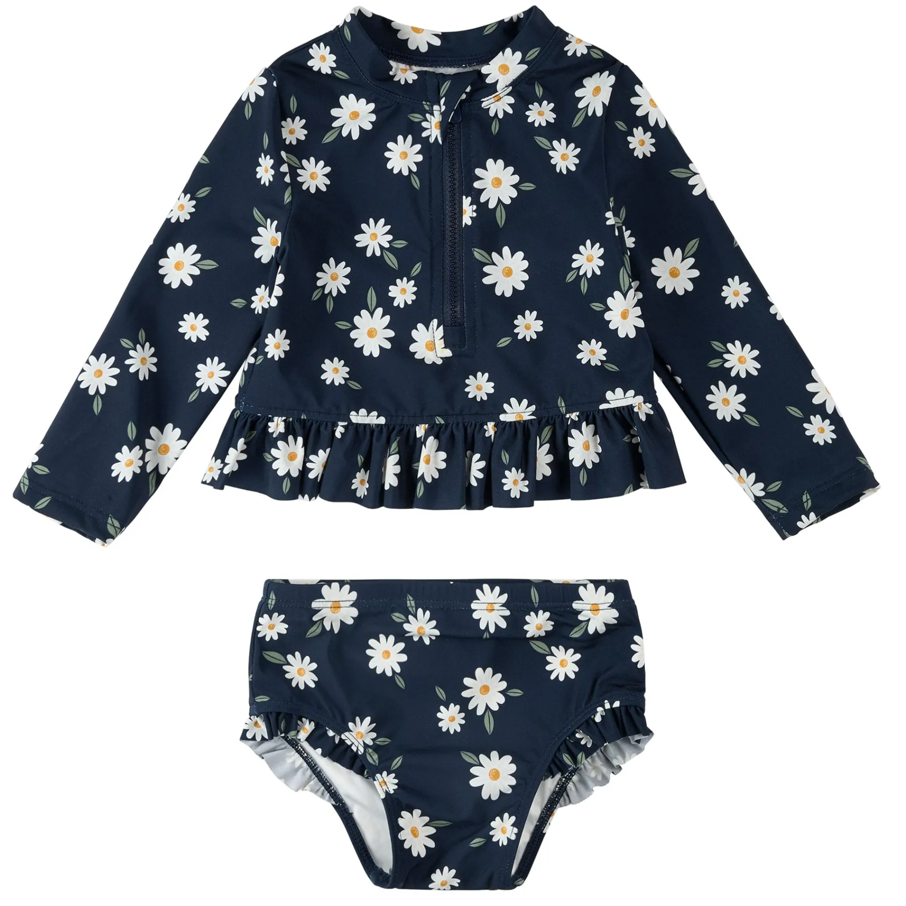Bringing a classic summery style to a pool or beach near you, this Daisies print rash guard set is perfect for splashing in the pool or building sandcastles at the beach. The 2-piece set includes a long-sleeved rash guard and high waisted pants, both helping to keep her delicate skin covered in the sun. Made with quick-drying weft knitted fabric, the set is comfortable wet or dry and is designed with UPF50+ sun protection. The cheerful set is stretchy, practical and fun, giving her the confidence to play freely on sunny days.