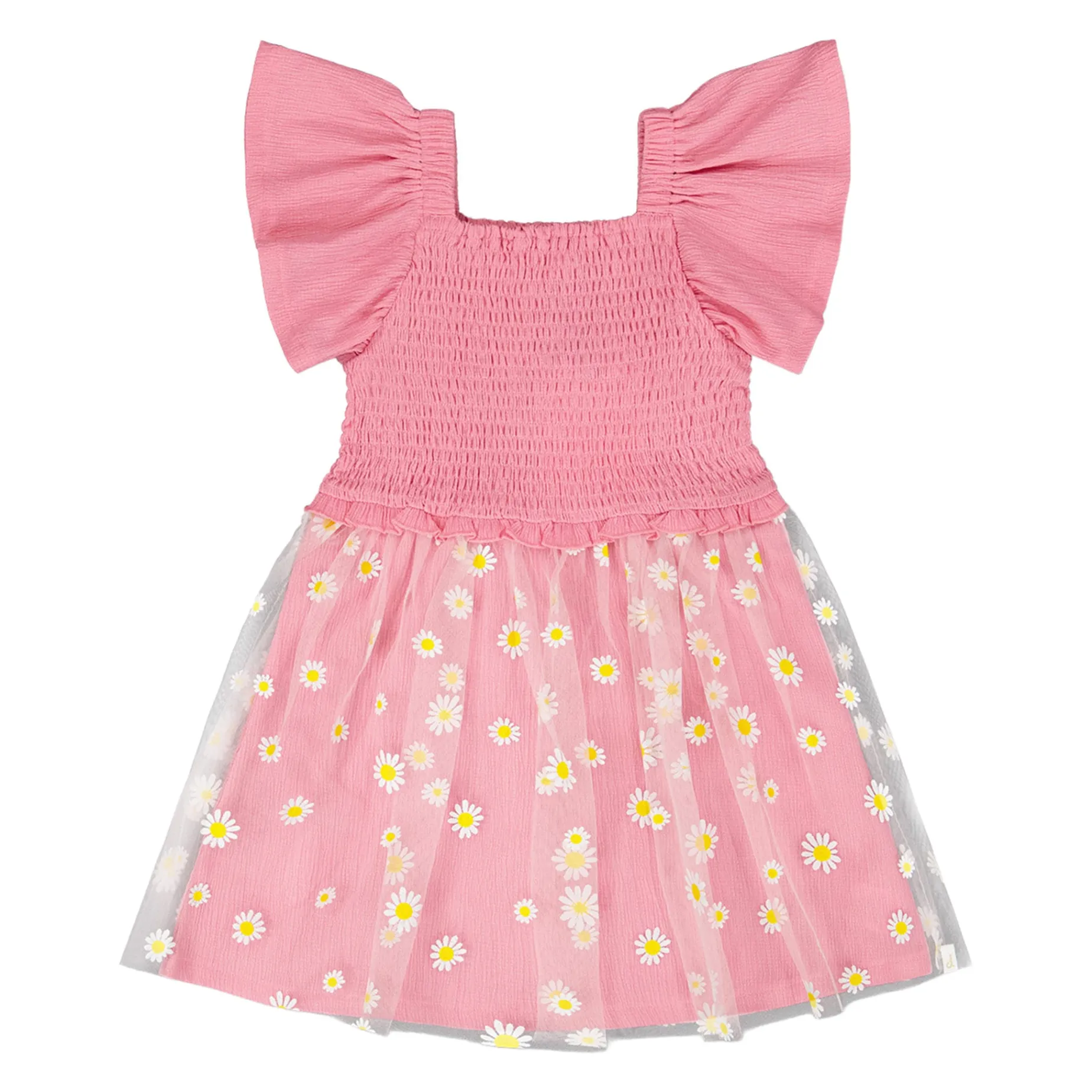 Delicate and breezy, our mesh and crinkle jersey dress with smocking in pink is made for sunny days. This sleeveless dress features stretchy smocking at the bodice, playful flutter straps, and a flared skirt with an allover daisy print. A joyful design that pairs perfectly with other cheerful looks from the “Explosion Of Daisies” collection.