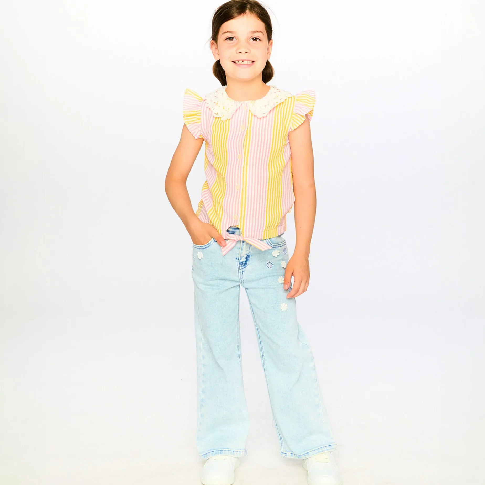 Fresh and stylish, our sleeveless shirt with pink and yellow stripes and a crochet collar is perfect for sunny days. This blouse features flutter details at the shoulders, a delicate crochet Peter Pan collar, a full front button placket, and a charming front tie knot for a playful twist. Part of the “Explosion of Daisies” collection, it pairs beautifully with skirts, shorts, or pants for an effortlessly chic summer look.