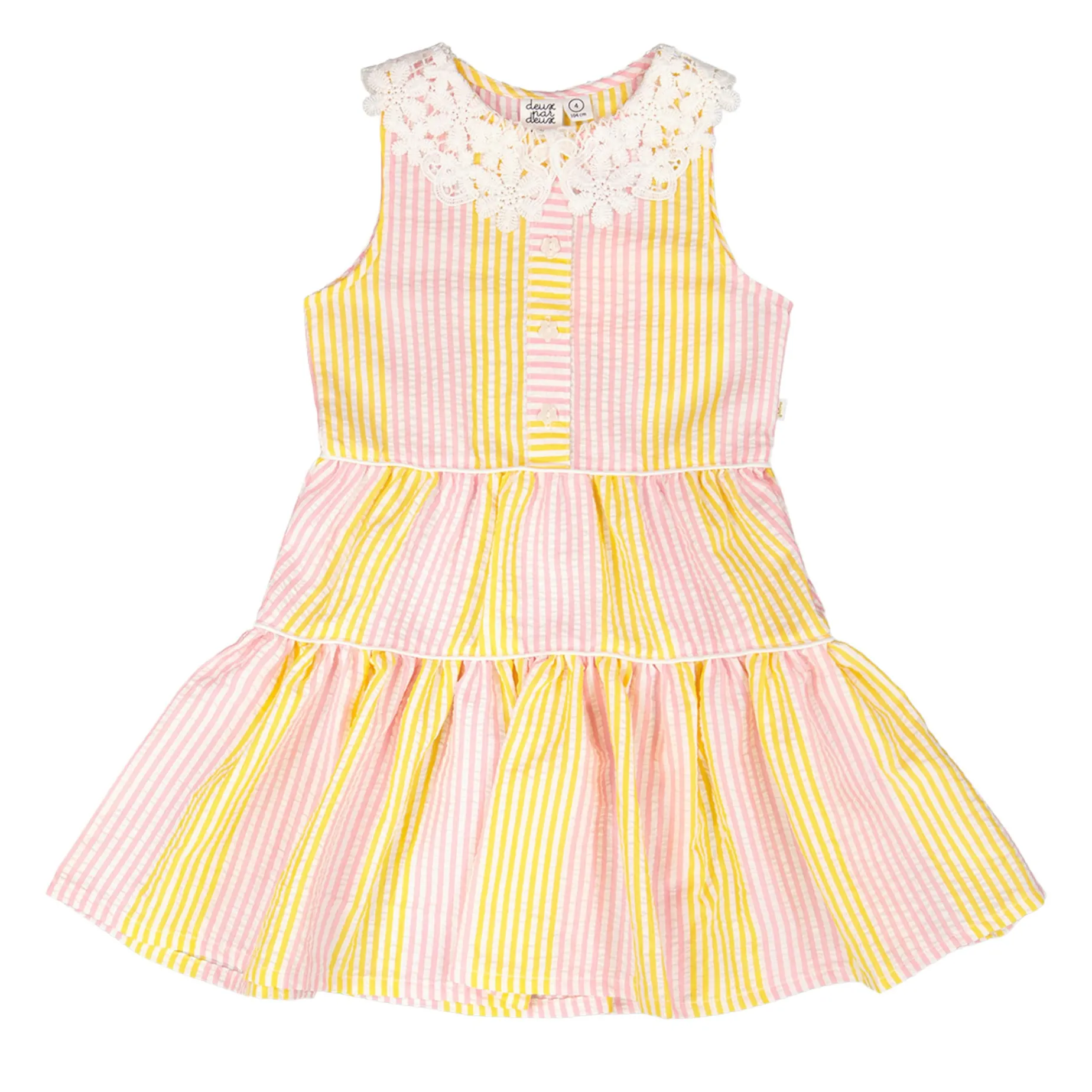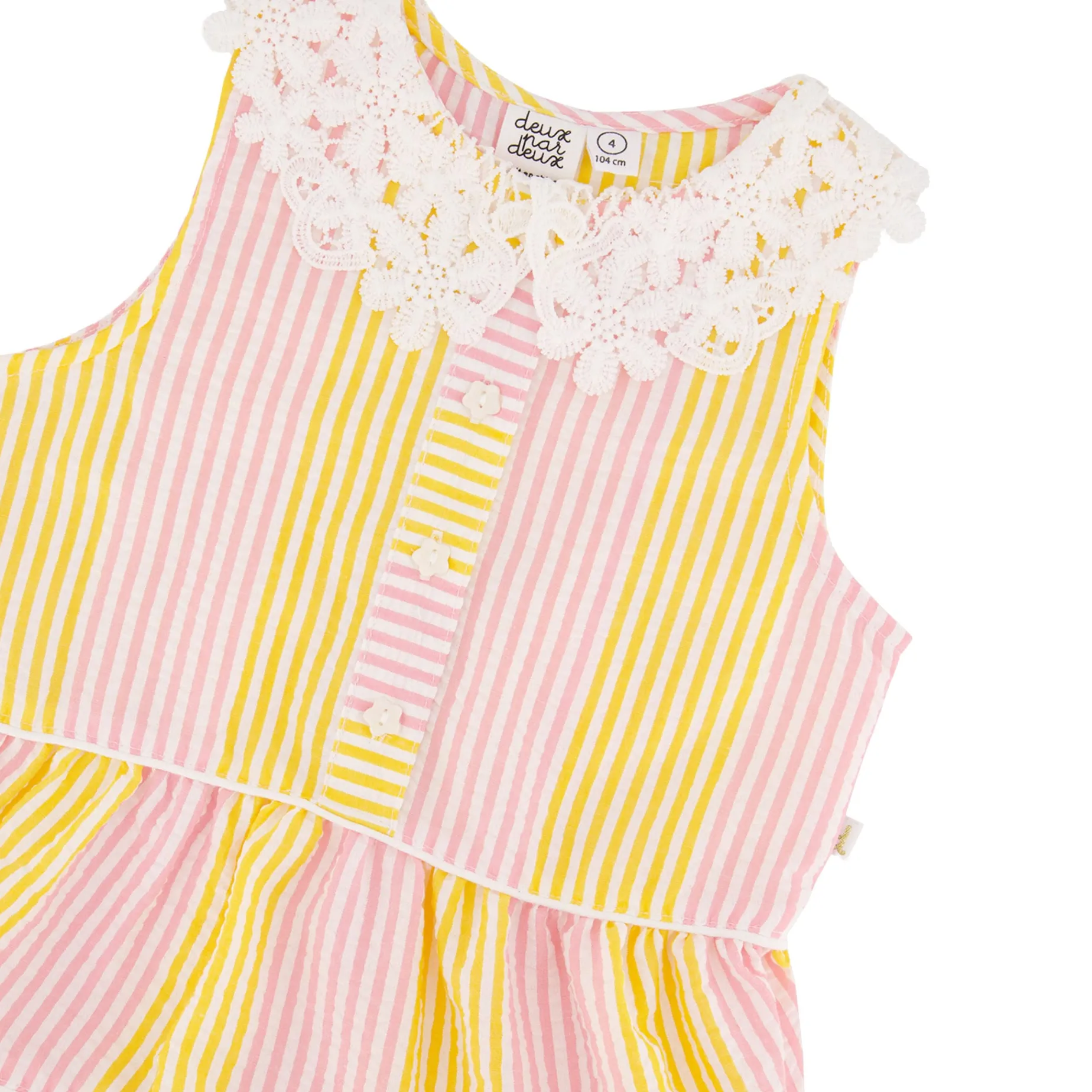 Charming and bright, our sleeveless dress with Peter Pan crochet collar in pink and yellow stripes is a summer essential. This casual dress features flutter sleeves, a scalloped crochet Peter Pan collar, a button-front opening, and a gathered tiered skirt for playful volume. Perfect for sunny days, it pairs beautifully with other pieces from the “Explosion Of Daisies” collection.