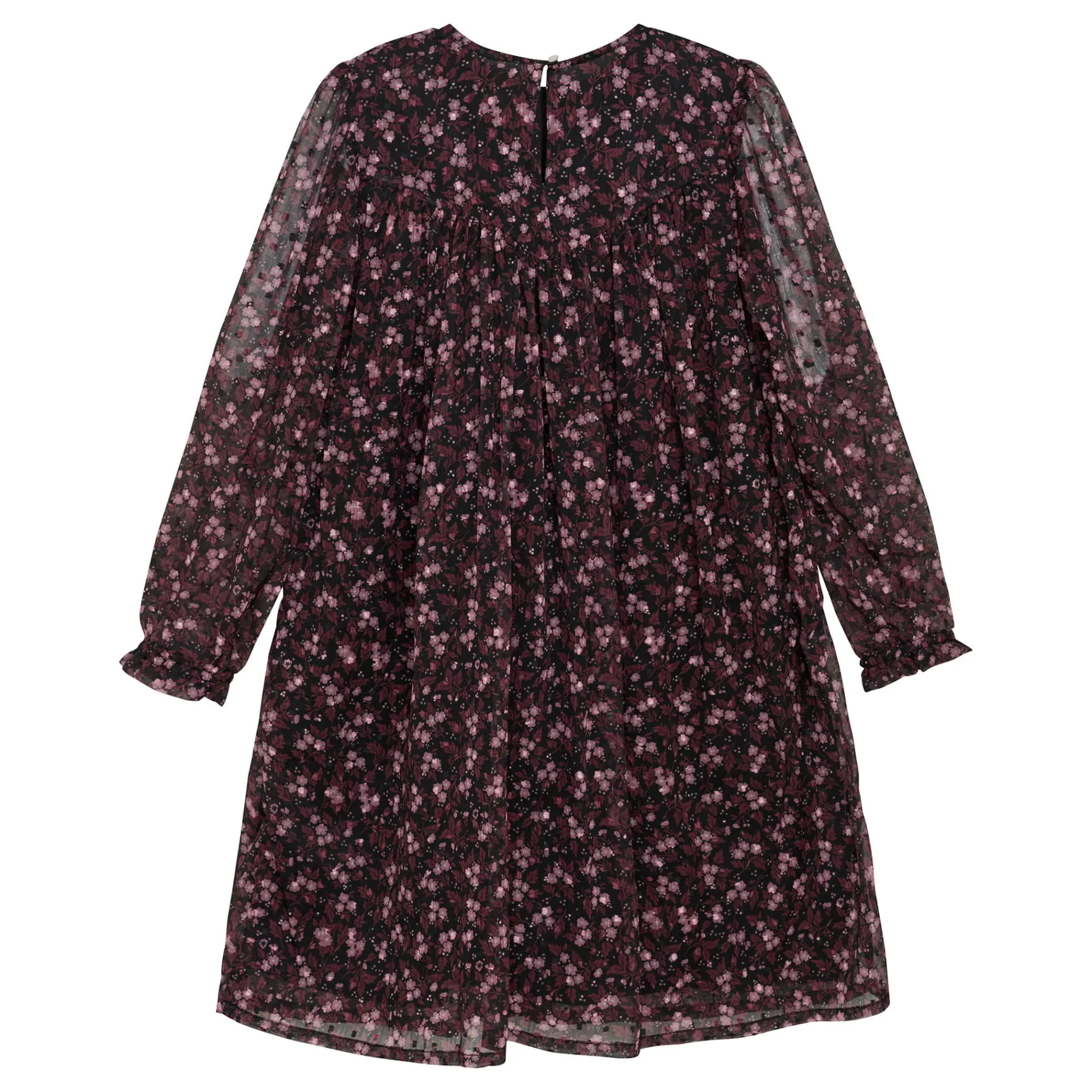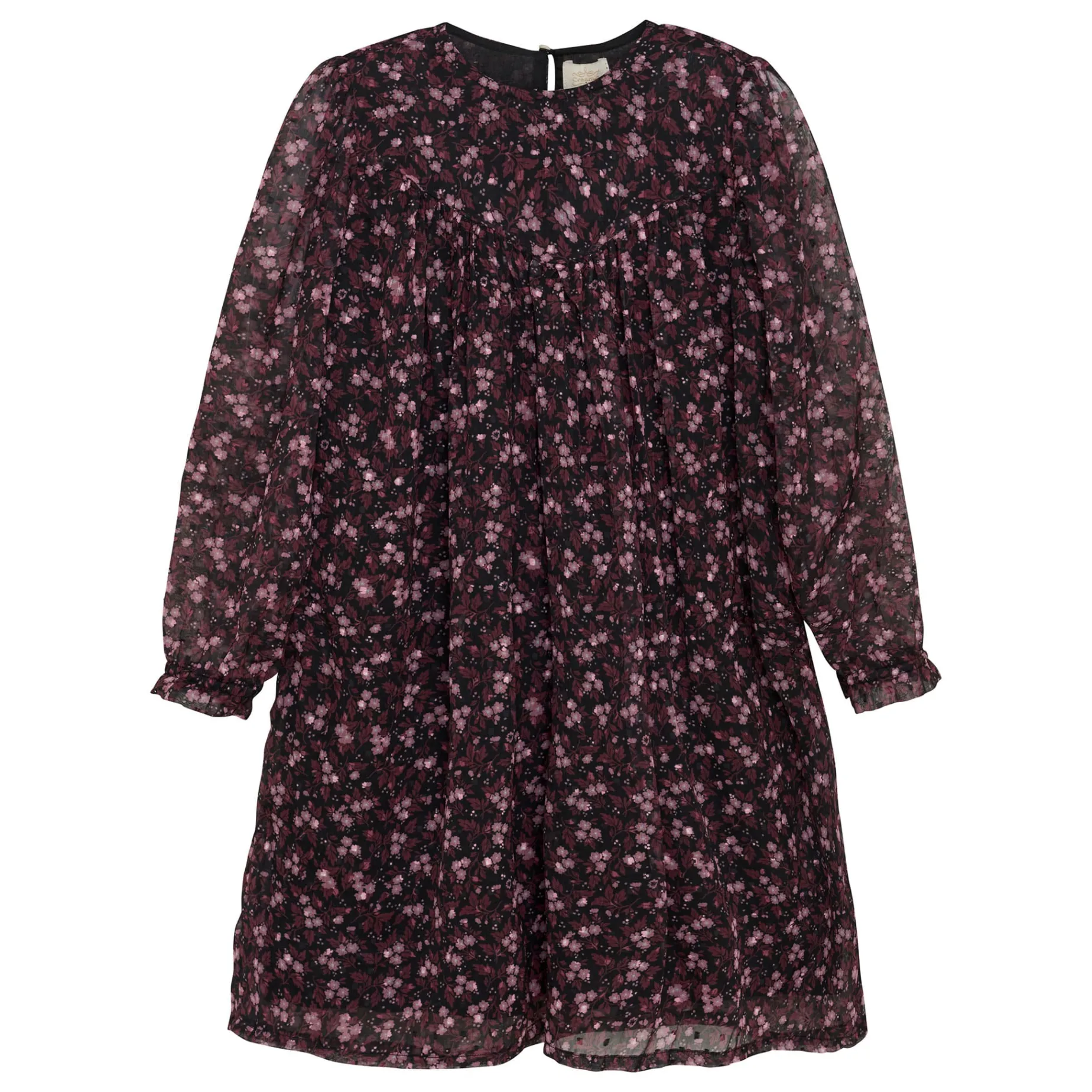 Floral dress from Creamie. The dress has a round neck and long, wide sleeves with elastic in the sleeve opening. From the chest, the dress goes into the skirt, which gives a good width and fine pleats. The dress is made of airy polyester with a cotton underskirt. The dress closes with a button in the back.