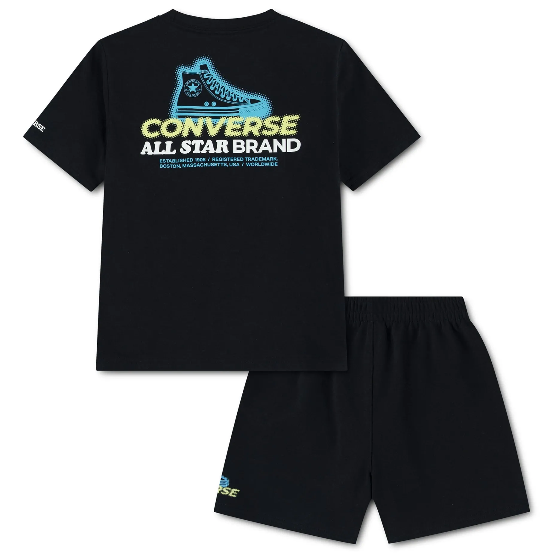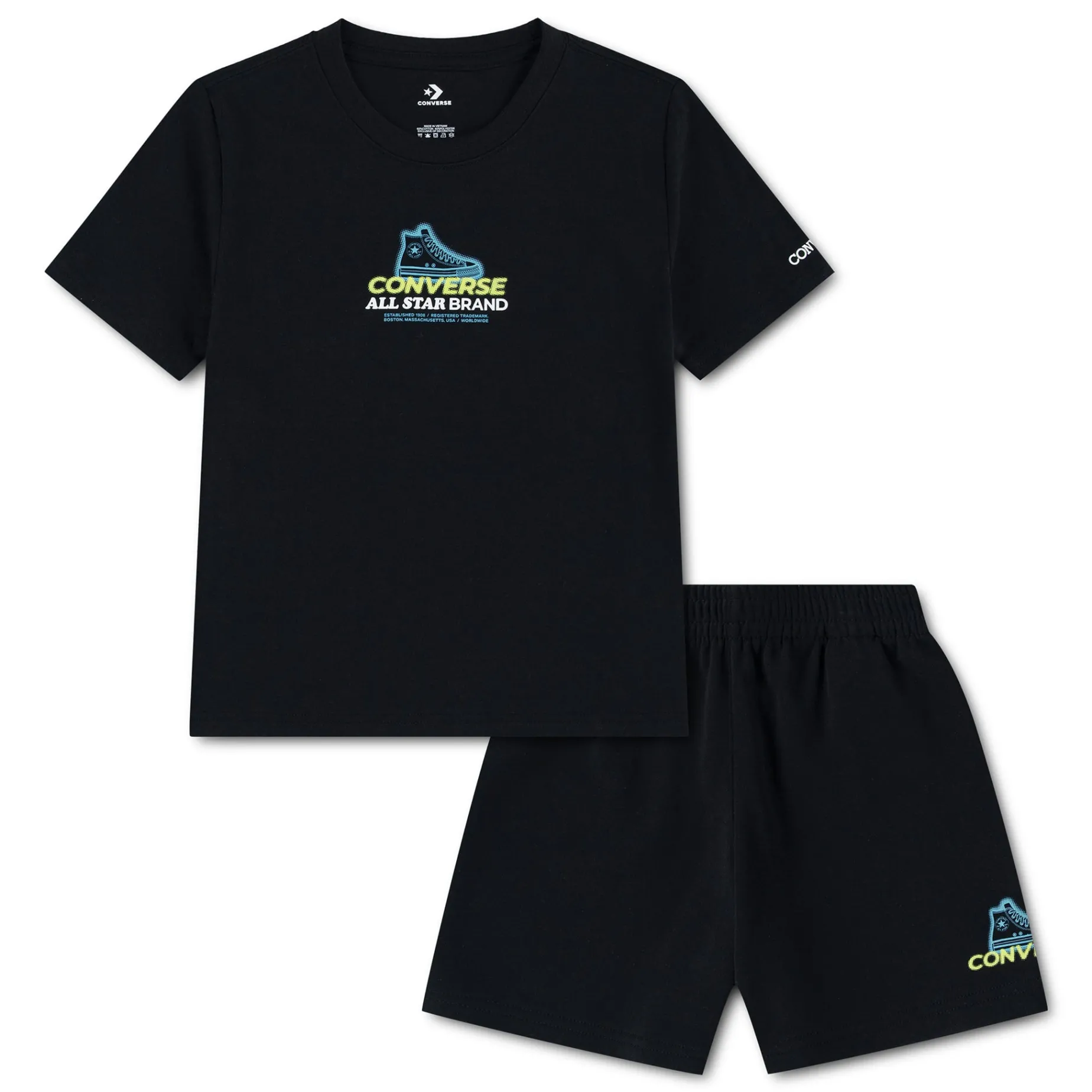 Easily dress your little All Star for the everyday with this 2-piece set from Converse. The jersey knit tee has a classic silhouette, features a bold graphics, and has a tagless crewneck for fuss-free wear. The matching French terry shorts feature a small logo graphic and have a stretchy waistband for a comfy fit that lasts all day.