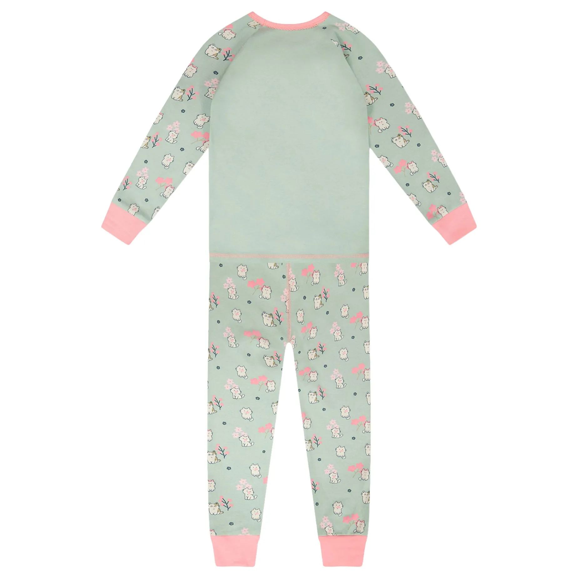 Cuteness overload is guaranteed with this two-piece pyjama set in a playful green kitten print. This set features a long-sleeve top with an adorable kitten holding a pink flower pairing perfectly with the matching pants covered in tiny kittens and blossoms, finished with pink fitted cuffs for extra charm. Made from soft organic cotton, this “Starry Night” collection set is as cozy as it is sweet, perfect for happy dreams.