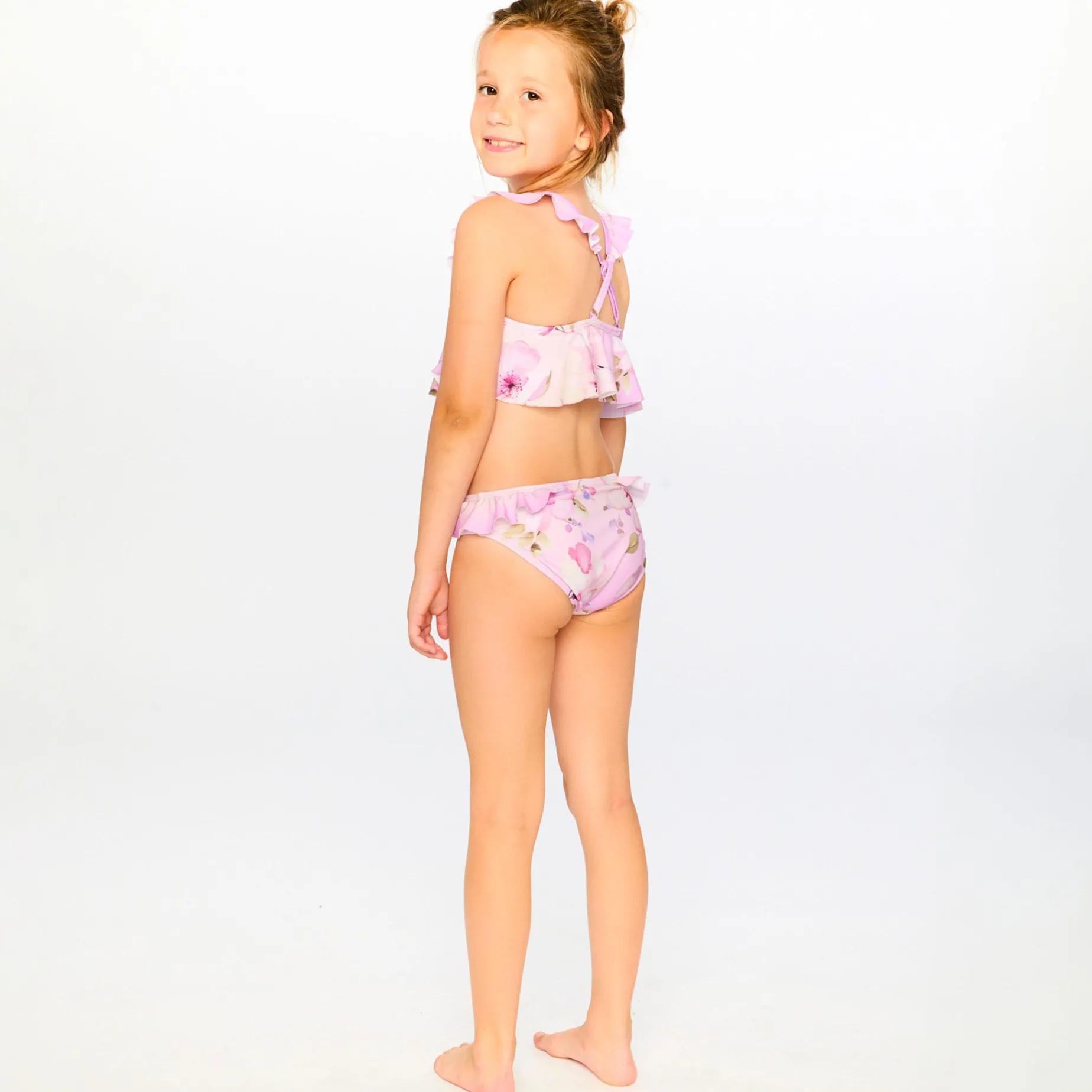 The two-piece swimsuit in purple with flower print is a sweet and playful set with ruffled crossed straps and a flared top. Made from recycled polyester with a touch of stretch, this swimsuit offers comfort, flexibility, and durability for summer adventures. A stylish and eco-friendly design from our “Like A Fish To Water” collection.