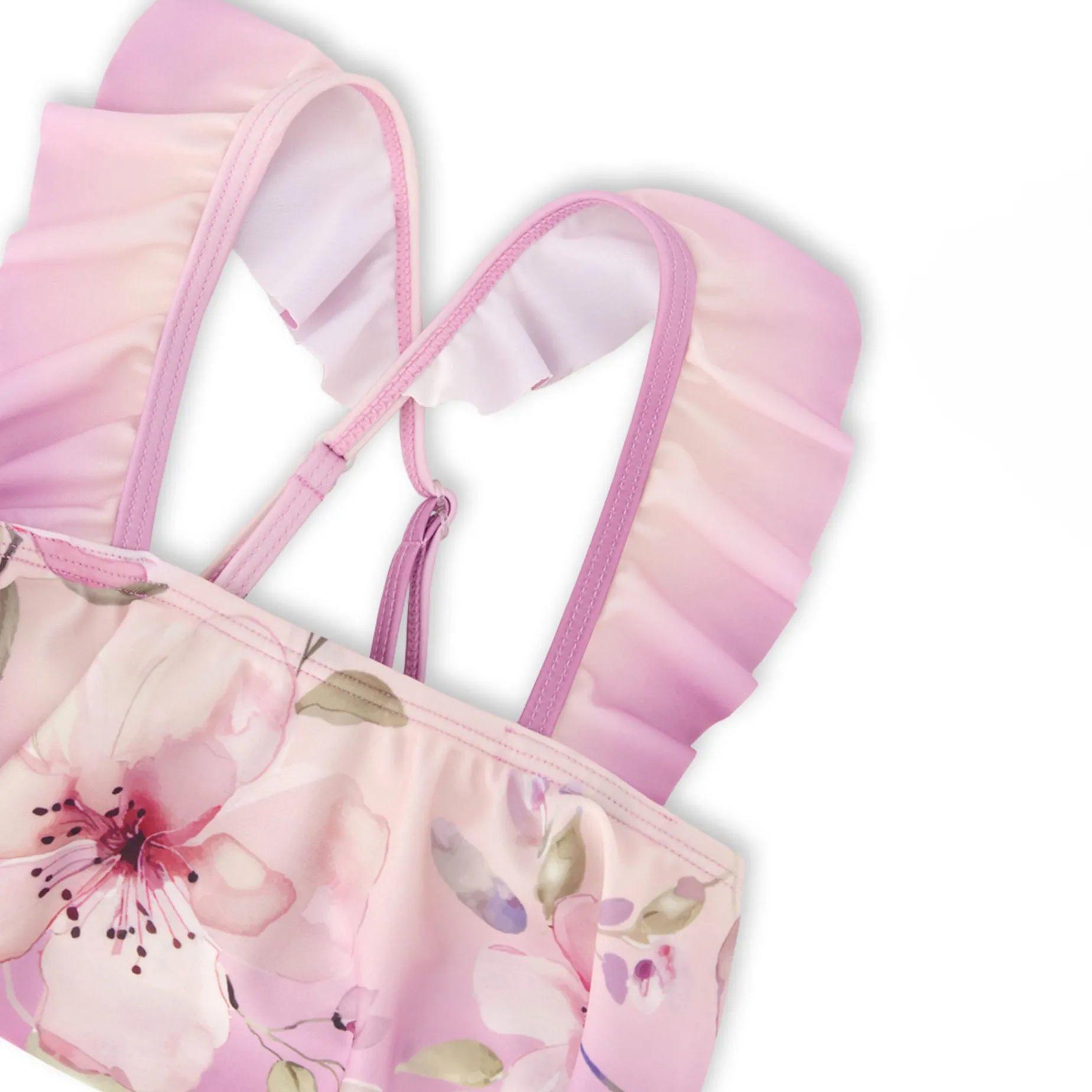 The two-piece swimsuit in purple with flower print is a sweet and playful set with ruffled crossed straps and a flared top. Made from recycled polyester with a touch of stretch, this swimsuit offers comfort, flexibility, and durability for summer adventures. A stylish and eco-friendly design from our “Like A Fish To Water” collection.