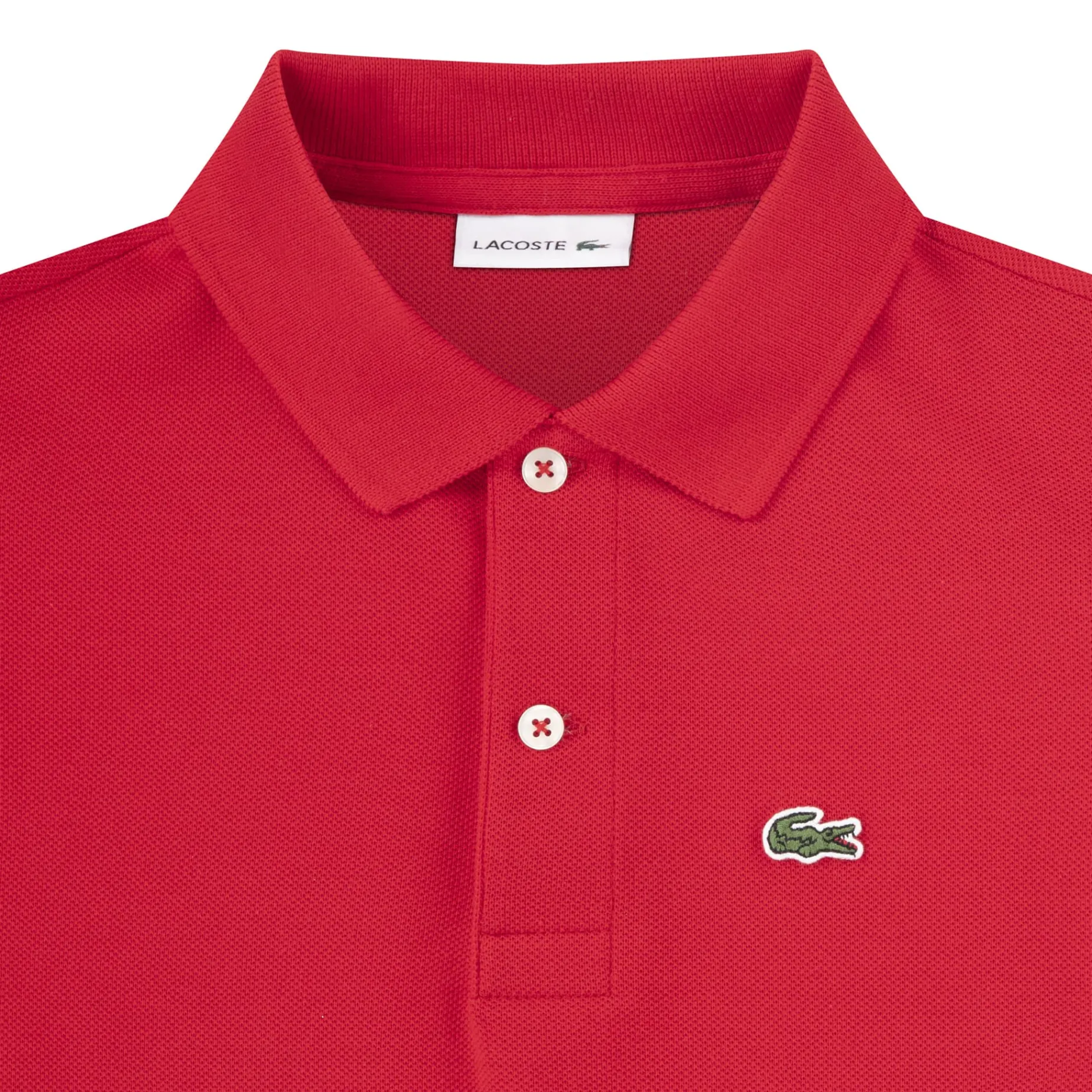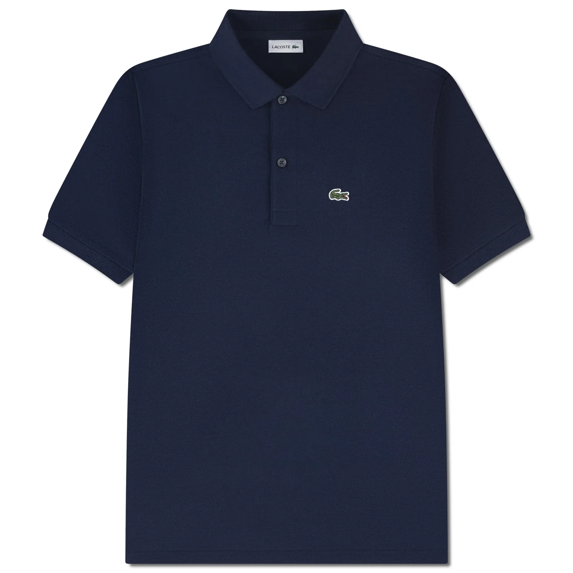 Features: Cotton petite pique knit fabric. Ribbed spread collar. Quarter-button closure. Short sleeves with ribbed cuffs. Embroidered crocodile logo patch.