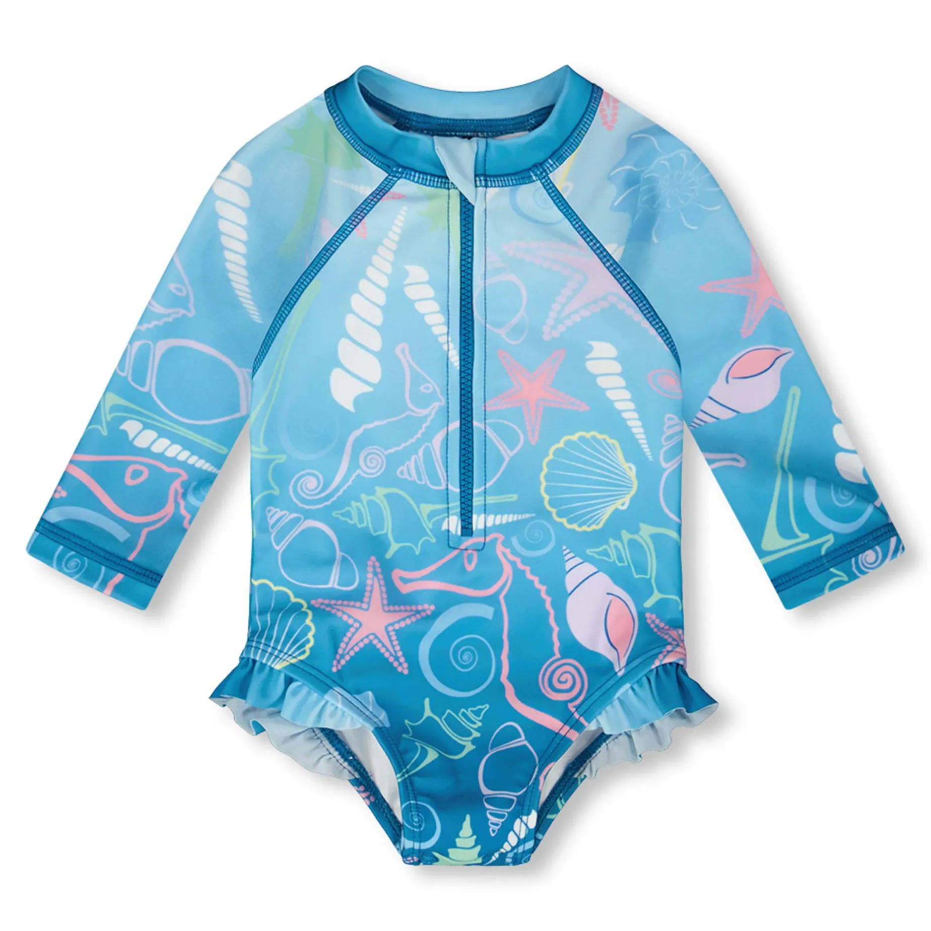 Delightfully practical, this baby and toddler one-piece long sleeve rashguard in blue with shell print is perfect for sun-filled adventures. The bathing suit features a half-zippered front, ruffles at the legs, an allover seashell, seahorse, and starfish print in soothing pastel tones, paired with long sleeves for extra coverage. Made from recycled polyester with added stretch, it ensures comfort, flexibility, and protection for little ones at the beach or pool.