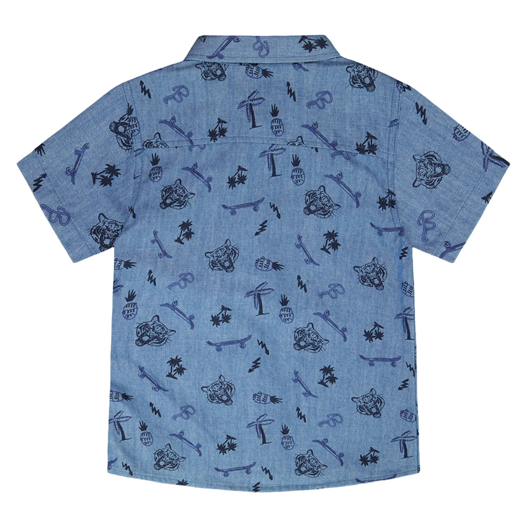 The printed chambray short-sleeve shirt in blue denim stripes is a stylish choice for boys’ everyday outfits. This lightweight cotton shirt features short sleeves, a classic collar, button-down front, and a striped chambray pattern in blue denim tones. Made entirely from soft breathable cotton, it’s a versatile piece from the “B.O.Y.S.” collection.