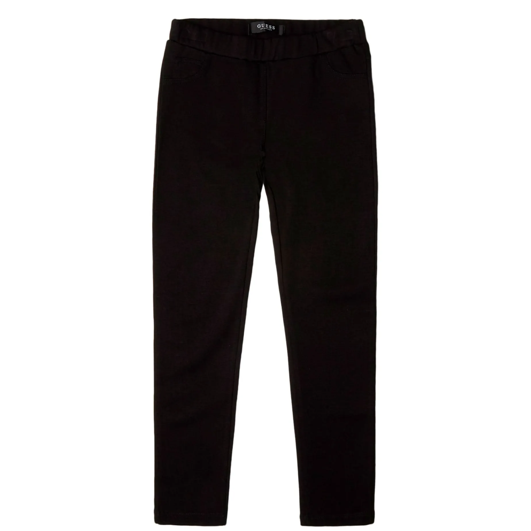 Features: Comfort of a legging in the look of a jean. Elastic waistband, back patch pockets with silver tone embroidered logo