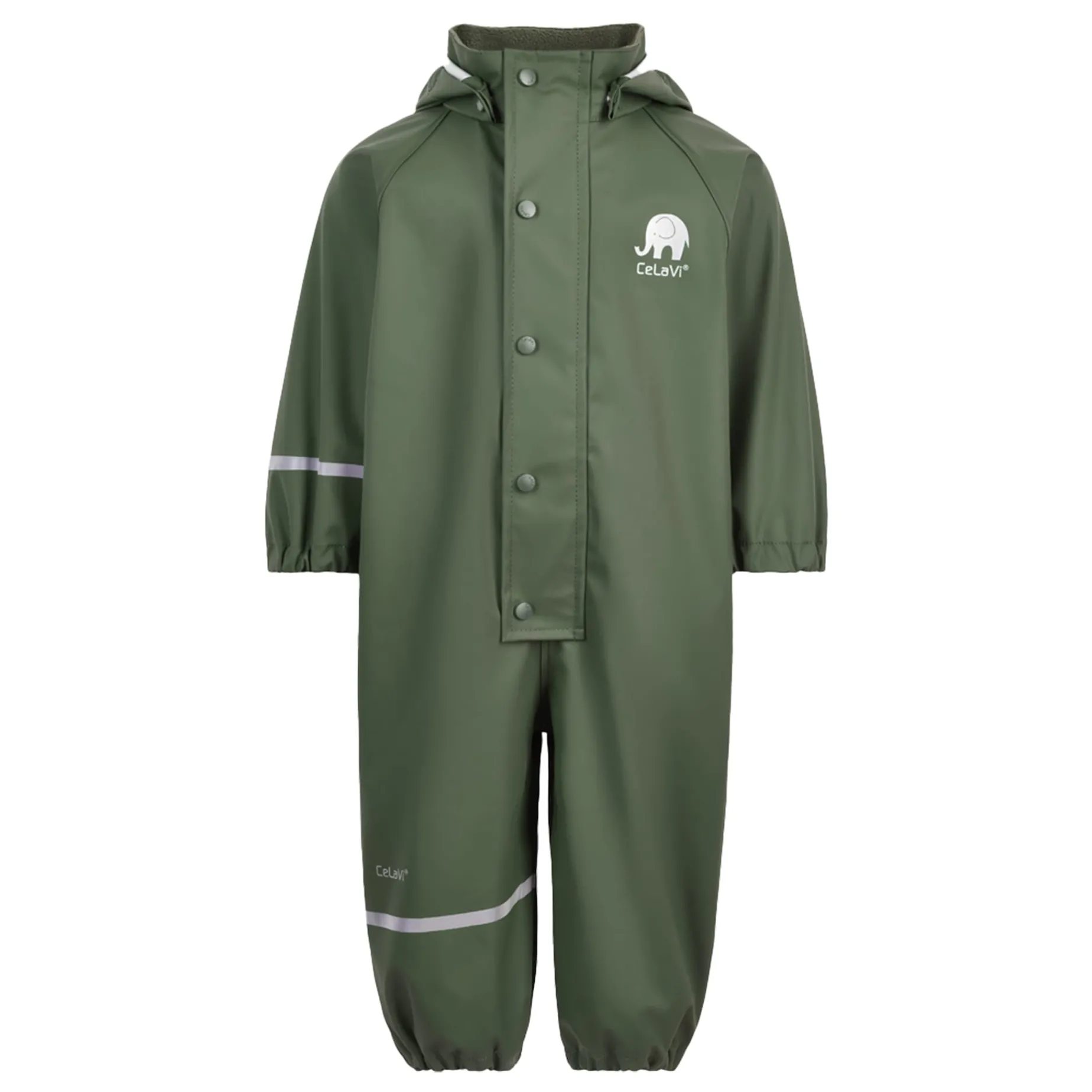 A superb PU rain suit from CeLaVi. It features narrow reflective strips around one sleeve and one leg. The upper arm and hood are adorned with reflective logos. The CeLaVi rain suit has a detachable hood that fastens with a snap-button collar. The hood opening, sleeves, and waist have elastic for a better fit. There are practical, adjustable elastic straps to go under your shoes. The rain suit closes at the front with a zipper and an external windproof flap that closes with snap buttons. Certified according to GRS – Made with 66% recycled materials CERES-0366