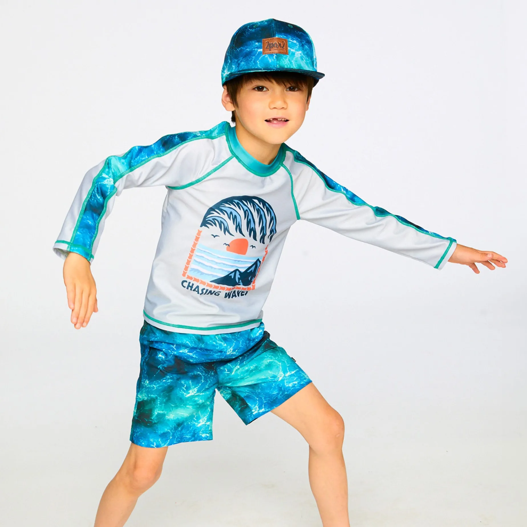 The swim trunks in blue with waves print capture the spirit of the ocean for summer adventures. These above-the-knee swim shorts feature a striking allover wave effect print in rich shades of blue, crafted in lightweight recycled polyester with a breathable mesh lining. An elastic waist with adjustable drawstring ensures a secure and comfortable fit for boys during all-day water play.