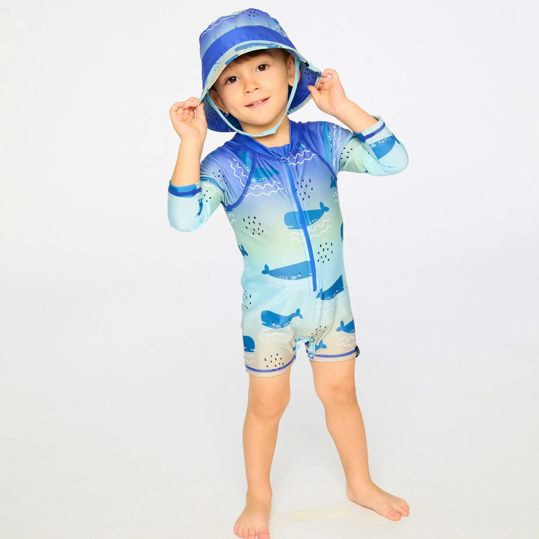 Our baby and toddler one-piece long sleeve rashguard in blue with whale print makes a splash in summer style. This one-piece swimsuit features long sleeves and a playful allover whale pattern in shades of blue, made from recycled polyester with added stretch for comfort and easy movement. A front zipper makes dressing simple while providing extra protection under the sun for boys and baby boys.